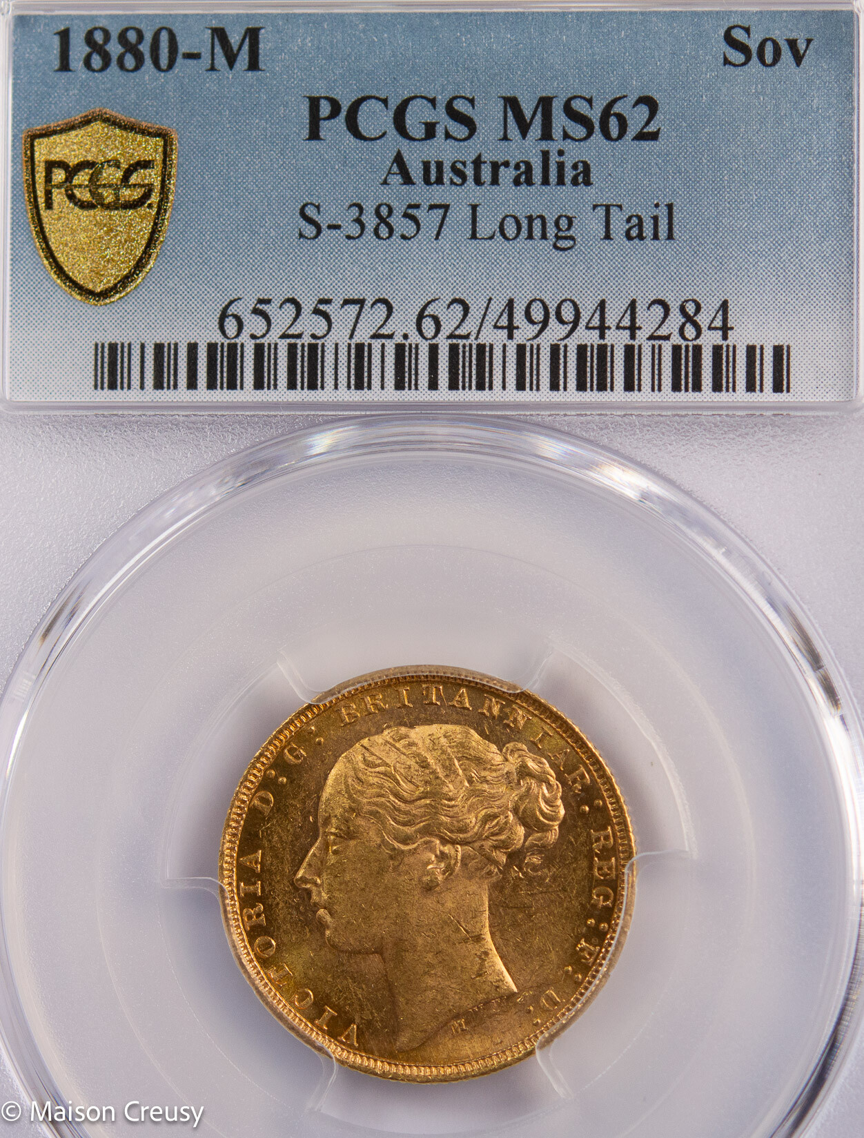 Monnaie en or frappée en 1880 à Melbourne (Australie) sous le règne de la reine Victoria, souveraine du Commonwealth. Au revers figure la célèbre représentation de Saint Georges terrassant le dragon.