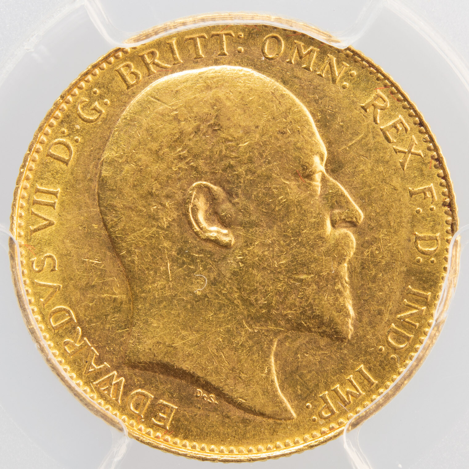 Souverain en or frappé sous Edward VII en 1910 à Ottawa au Canada. Seulement 28012 exemplaires frappés. Monnaie gradée par PCGS Cleaned AU-detail