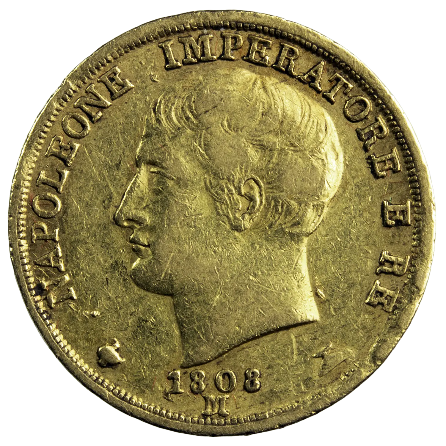Pièce de 20 lire or de Napoléon I roi d’Italie, monnaie frappée en 1808 à Milan. Tête nue de Napoléon à gauche à l’avers