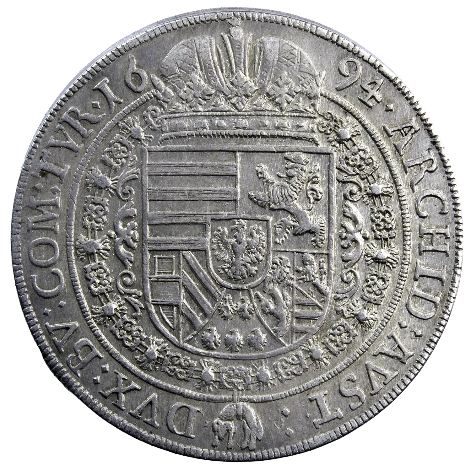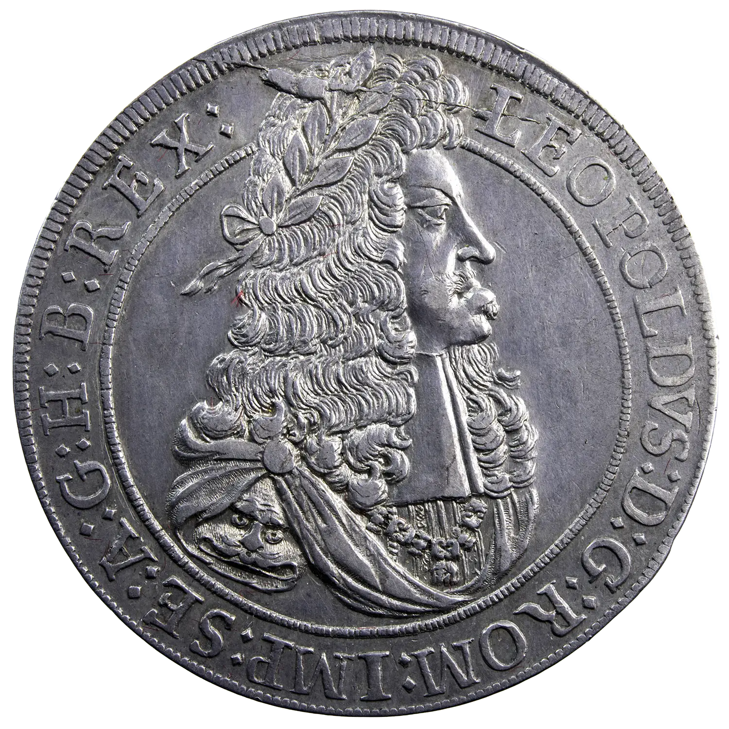 Thaler en argent de Leopold I empereur du Saint-Empire, monnaie frappée en 1694 à Hall. Superbe avec une petite cassure de coin à 12h à l’avers.