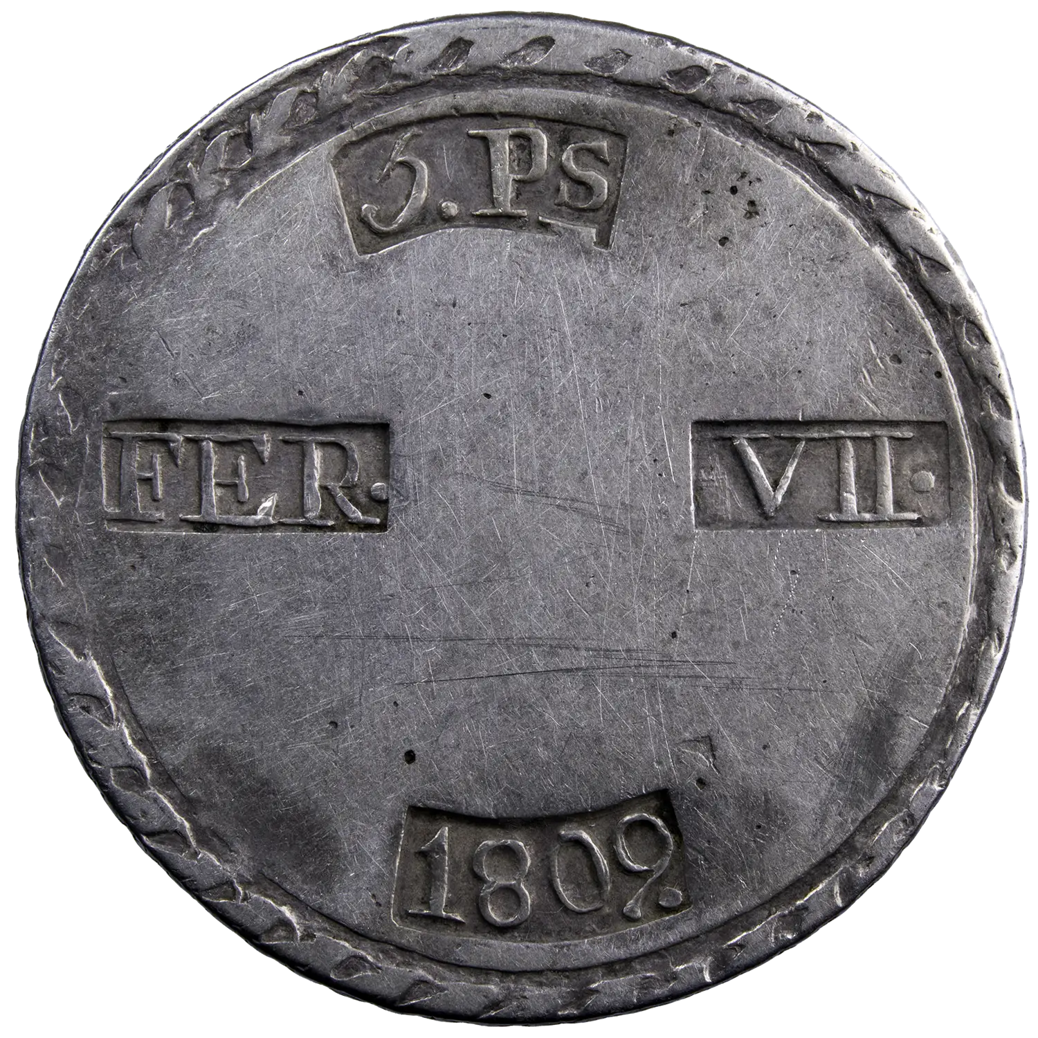 Monnaie obsidionale frappée durant le siege de Tarragone de 5 pesetas 1809.
