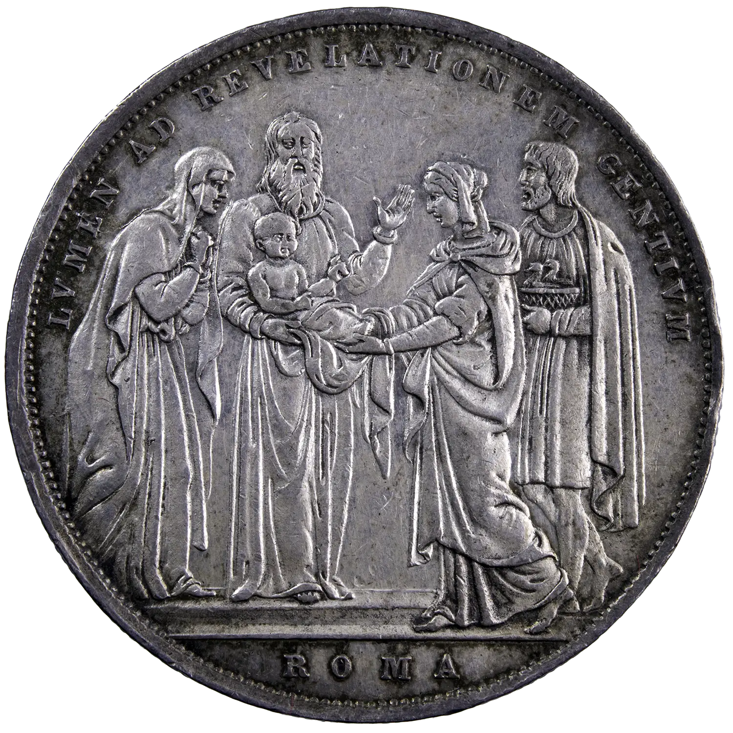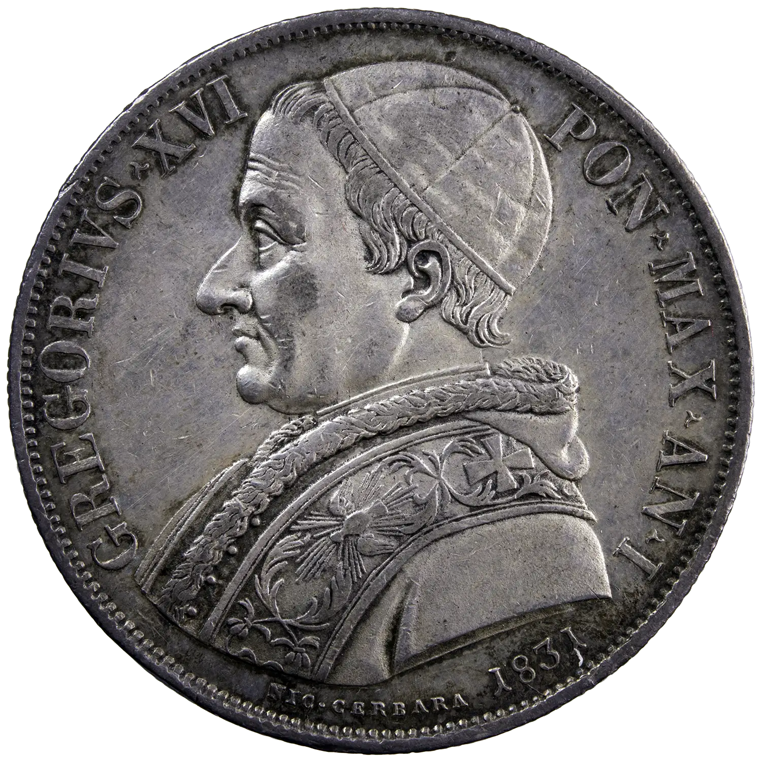 Scudo Romano ou 100 Baiocchi en argent frappé sous le Pape Grégoire XVI en 1831 à Rome. Scene de la présentation de l’enfant Jesus au temple au revers.