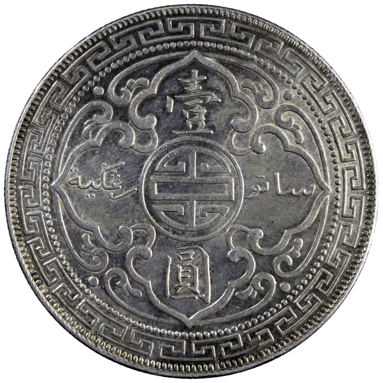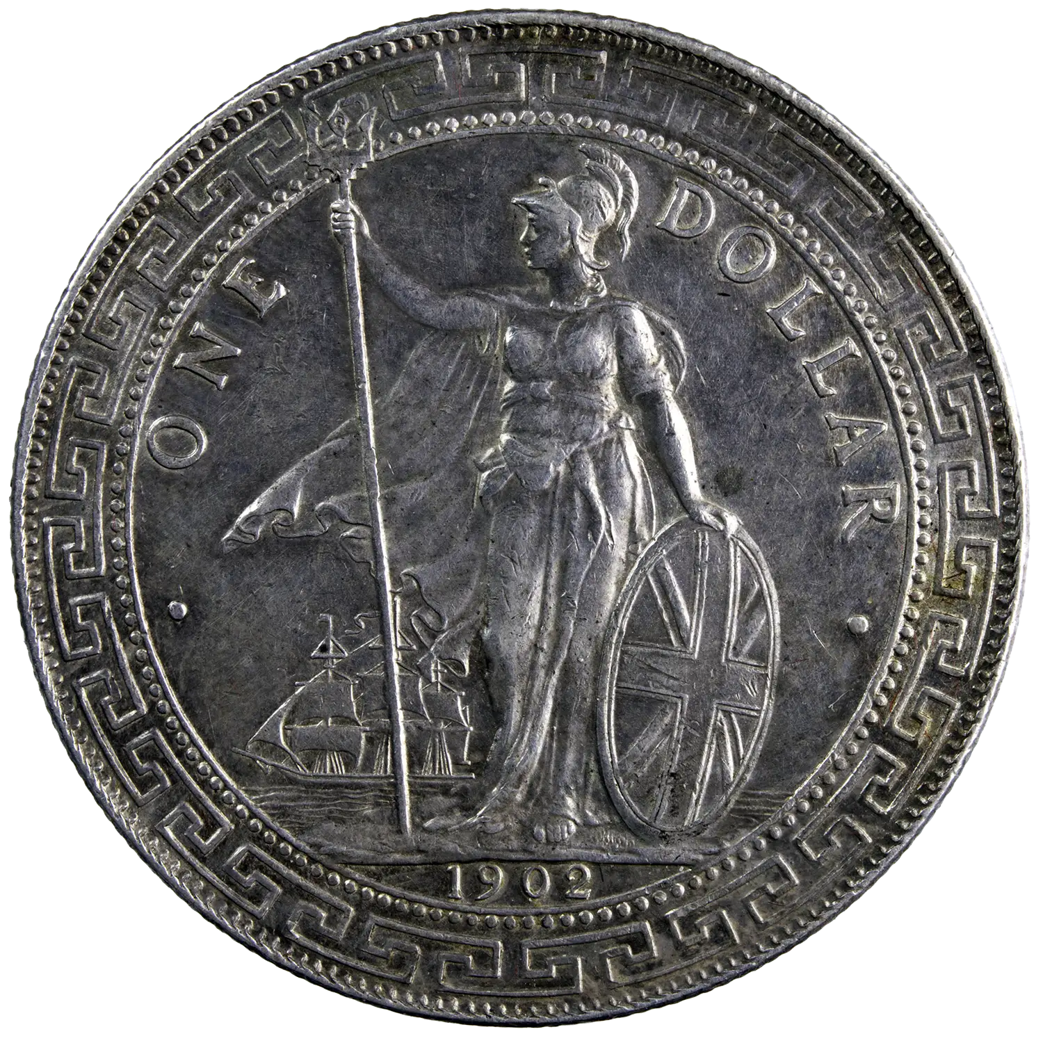 Trade dollar en argent frappé à Bombay en 1902. Monnaie émise pour faciliter les échanges commerciaux britanniques en Orient ; le revers intégrait la valeur faciale en caractères chinois et en écriture malaise (Jawi).