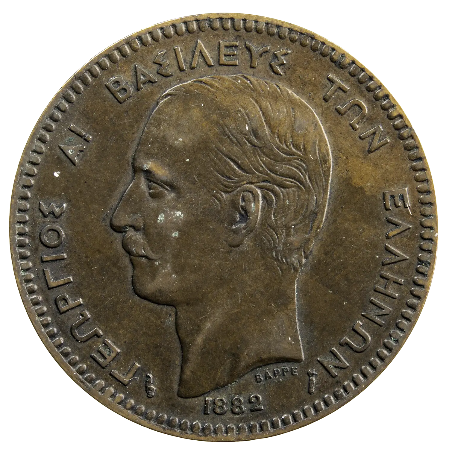 Pièce en bronze de 10 lepta frappée pour Georges I roi de Grèce en 1882 à Paris lettre d’atelier A.