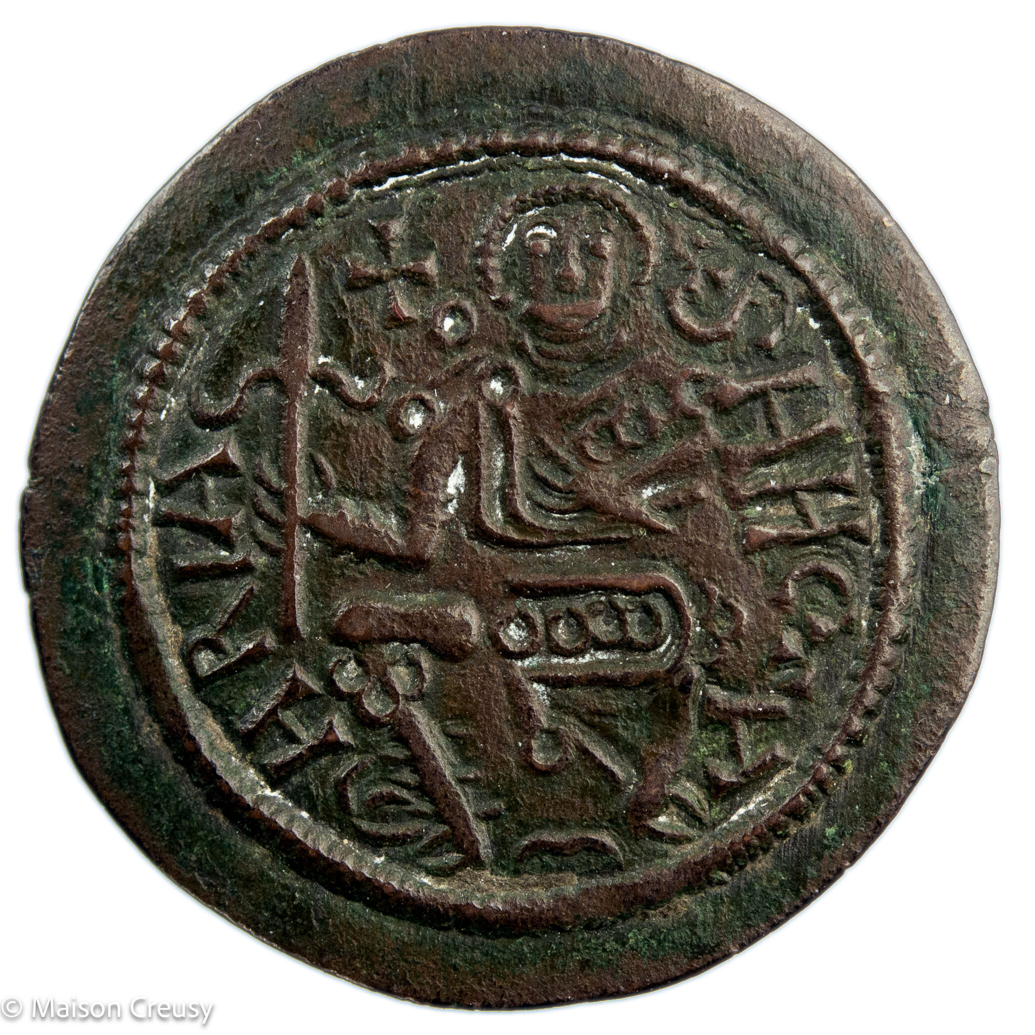 Follis de bronze frappé par le roi de Hongrie Béla III qui régna de 1172 à 1196. La monnaie est très légèrement scyphate dans le style byzantin.