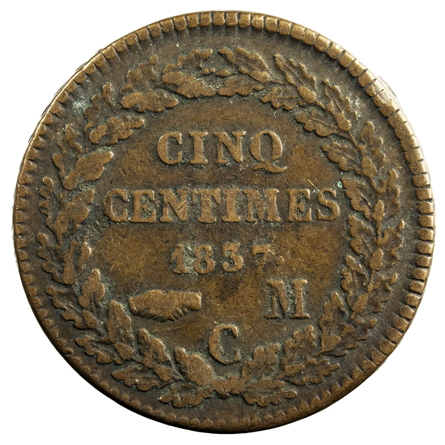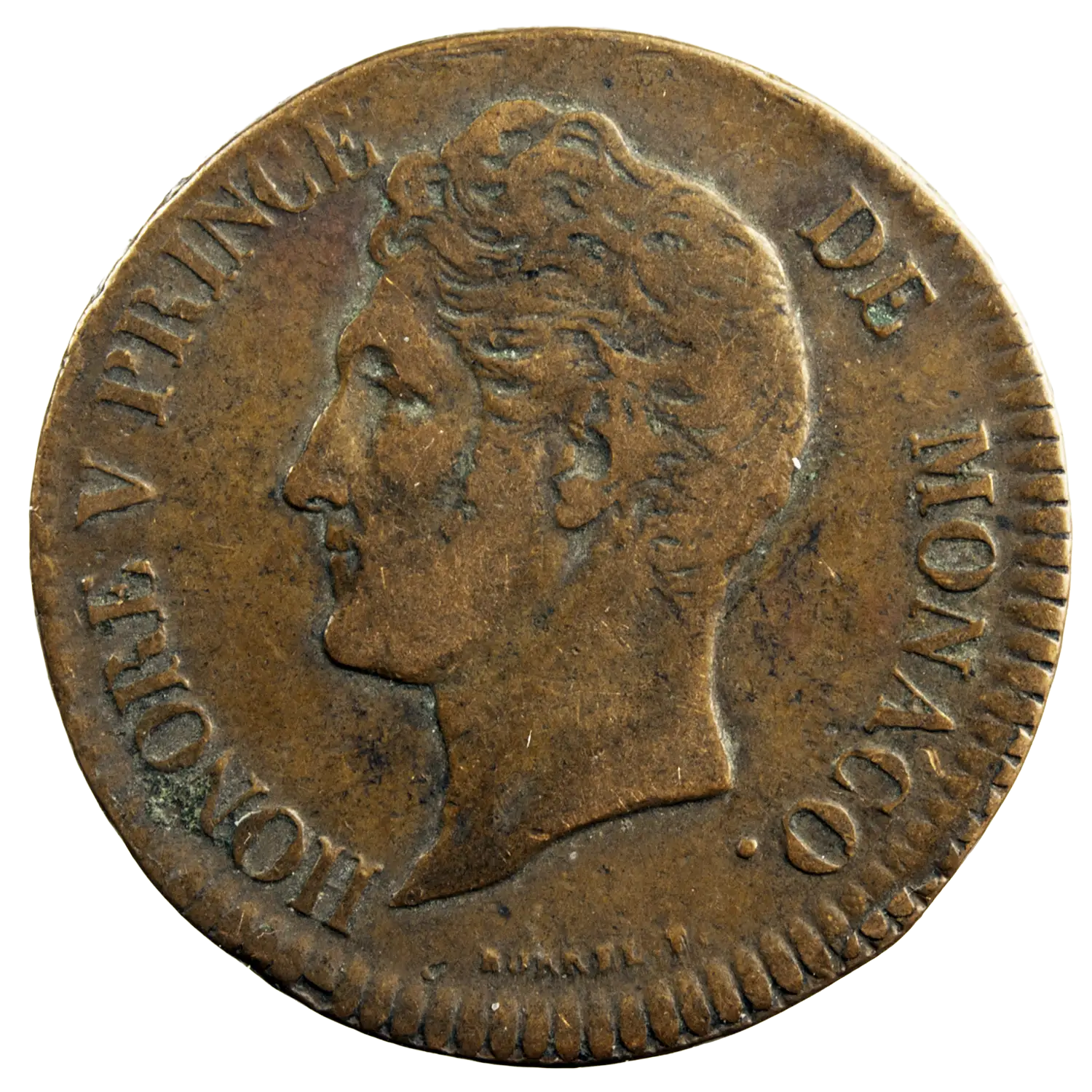 5 centimes en cuivre d’Honore V prince de Monaco, monnaie frappée à Monaco en 1837. Tête nue d’Honore à gauche à l’avers, tranche chevronnée.