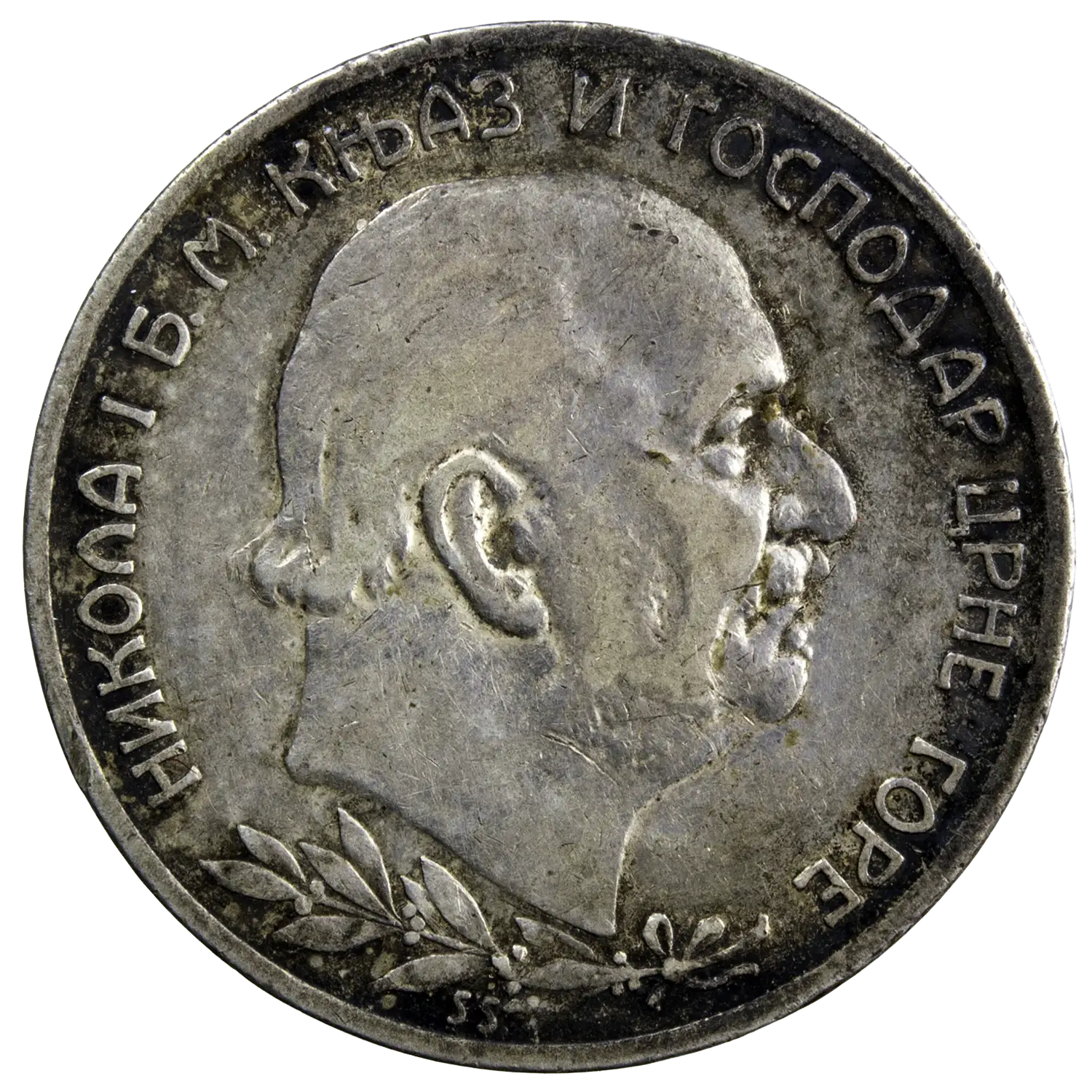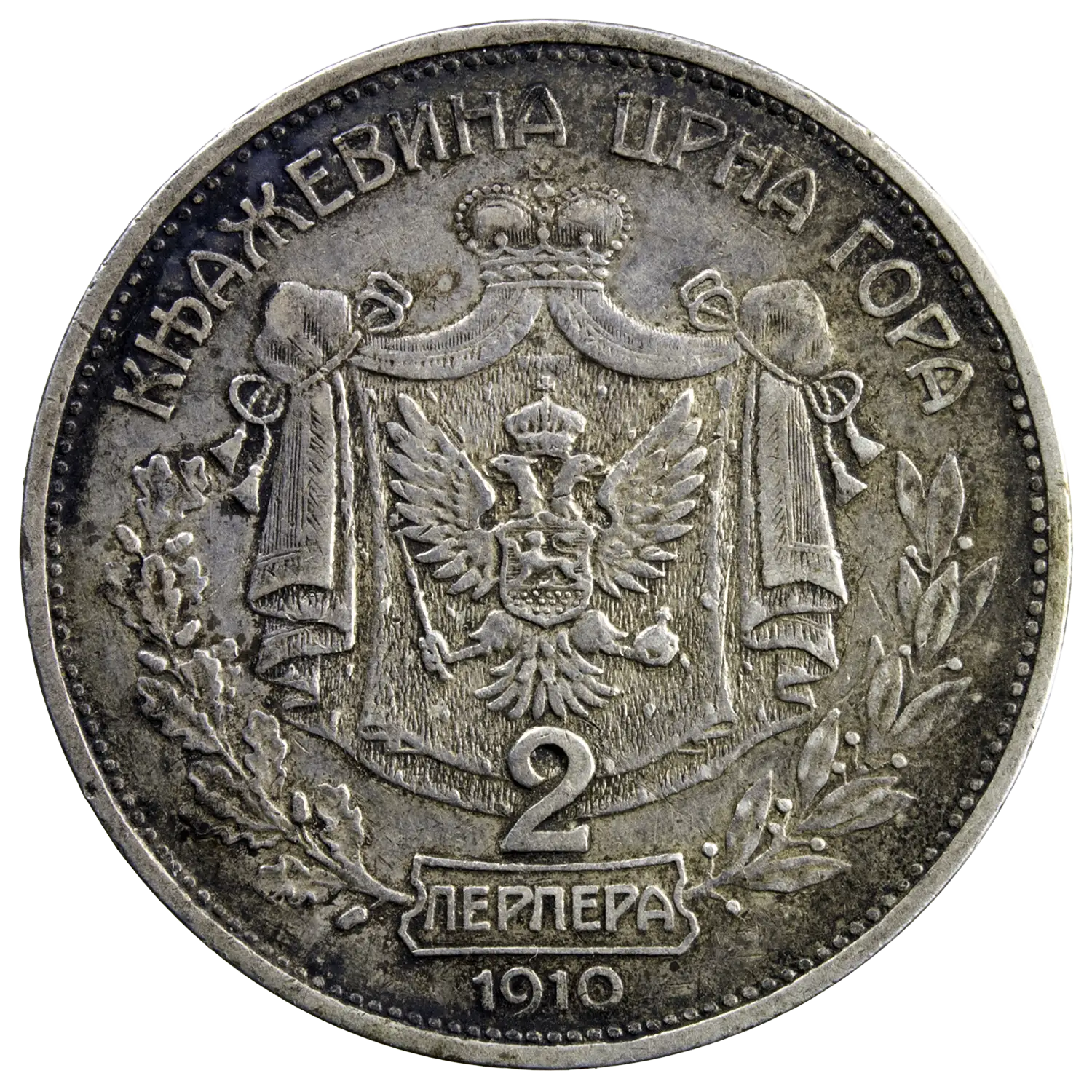 Monnaie de 2 perpera de Nicolas I frappée en 1910 à Vienne en Autriche. Armoirie du Montenegro au revers