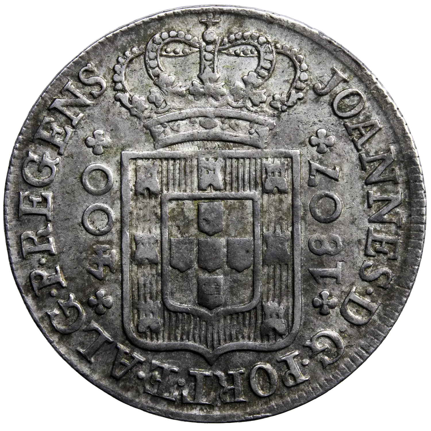 Pièce en argent de 400 reis frappée sous Jean VI futur roi du Portugal en tant que régent. Monnaie frappée en 1807 à Lisbonne.