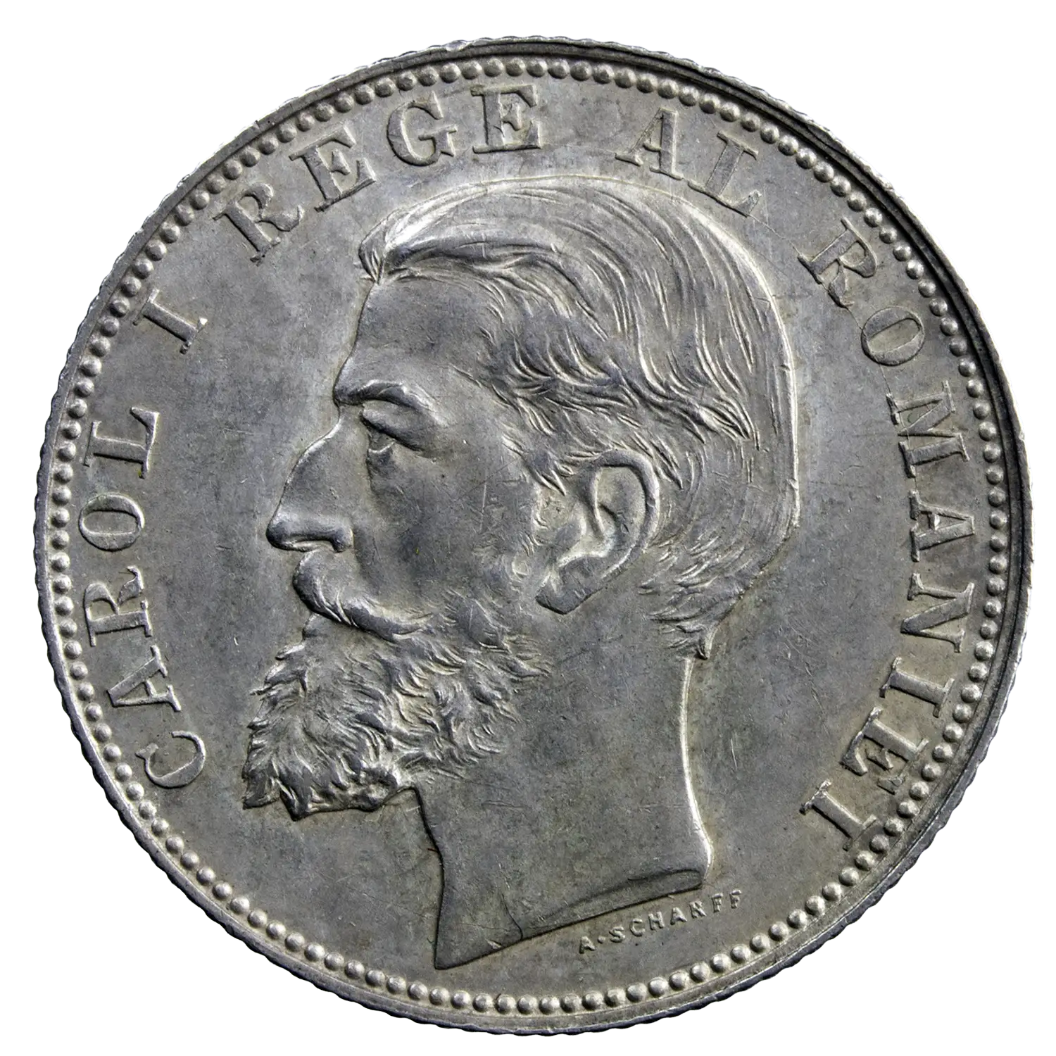 Monnaie de 2 Lei frappée sous Carol Ier roi de Roumanie en 1894 à Bruxelles. De très belle qualité. Tête nue de Carol à gauche à l’avers