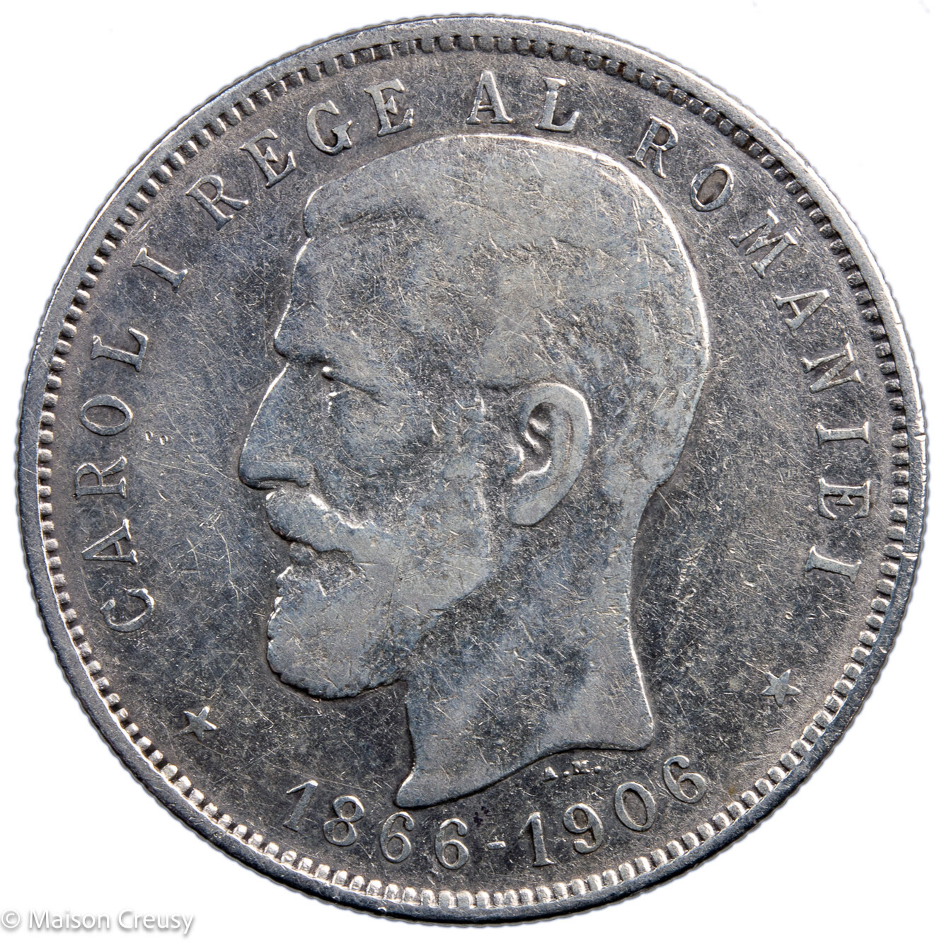 Pièce de 5 lei de Carol Ier roi de Roumanie, Monnaie frappée en 1906 pour le 40ème anniversaire du règne de Charles.