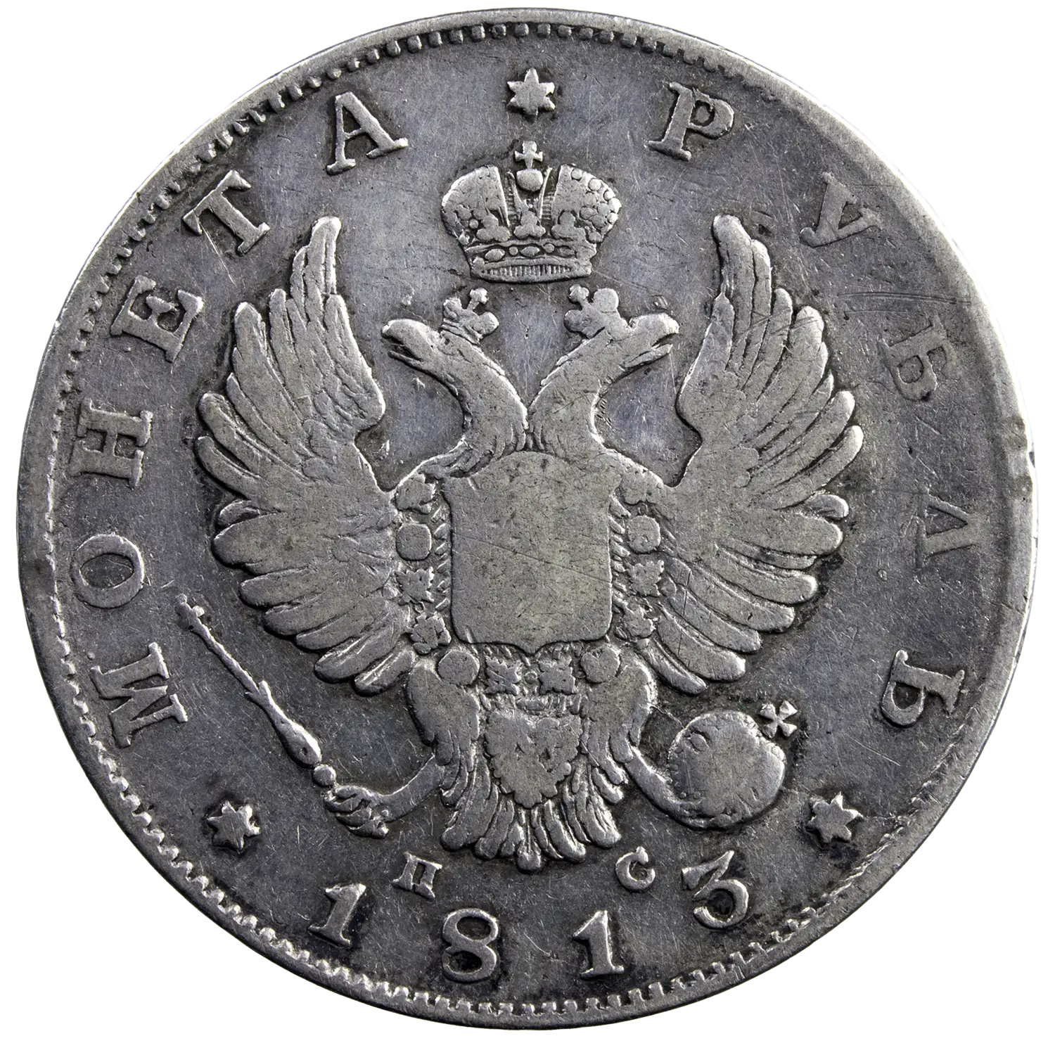 Rouble en argent frappé à Saint-Petersbourg en 1813 sous Alexandre Ier tsar de Russie. Aigle bicéphale à l’avers