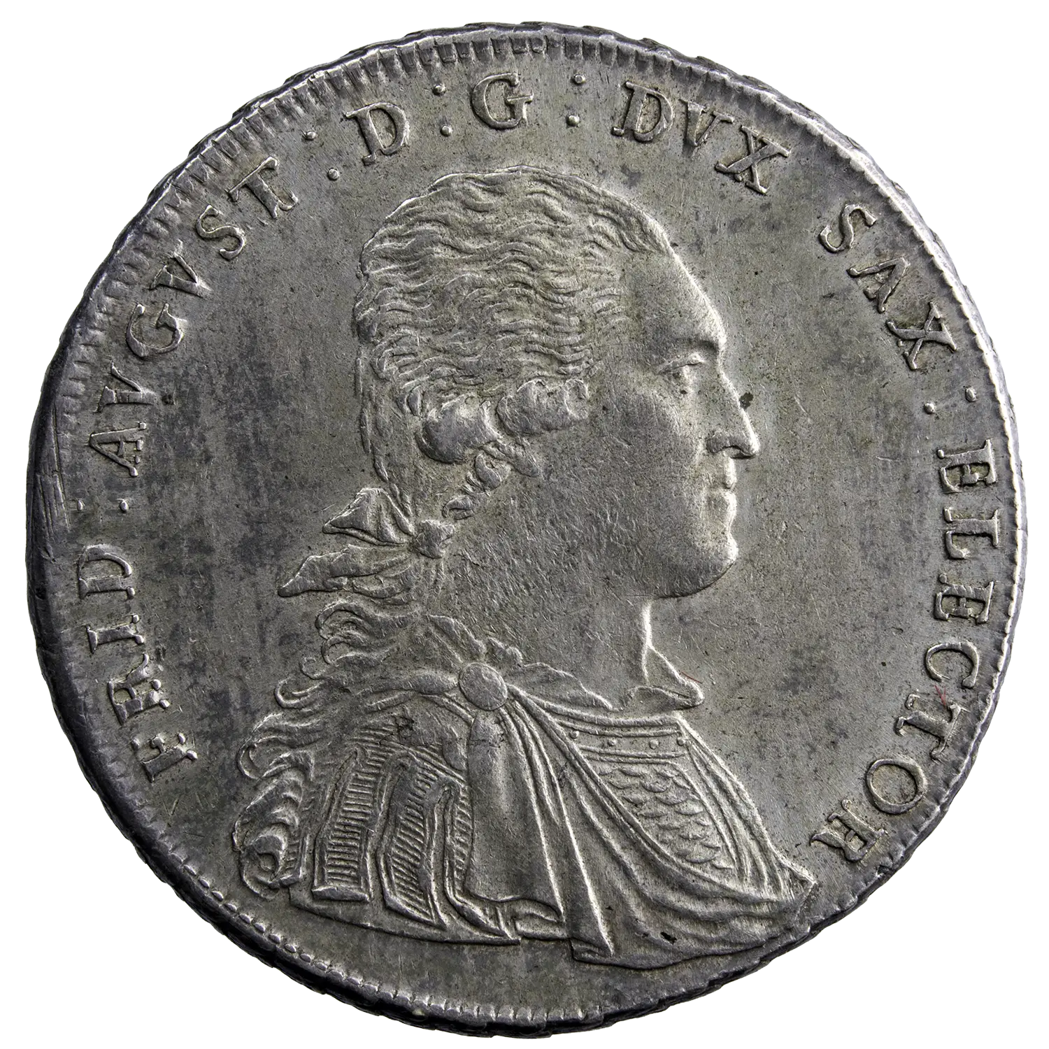 Frédéric-Auguste III de Saxe (1750-1827), de la branche albertine de la maison de Wettin, régna comme électeur de Saxe de 1763 à 1806. Héritier du trône dès l’âge de 13 ans après la mort de son père, il gouverna longtemps dans une période marquée par la montée des tensions européennes à la fin du XVIIIᵉ siècle. En 1791, date de la frappe du thaler que vous mentionnez, il portait encore le titre d’« électeur de Saxe » au sein du Saint-Empire romain germanique. Ce n’est qu’en 1806, avec la dissolution de l’Empire par Napoléon, qu’il devint roi de Saxe sous le nom de Frédéric-Auguste Ier.