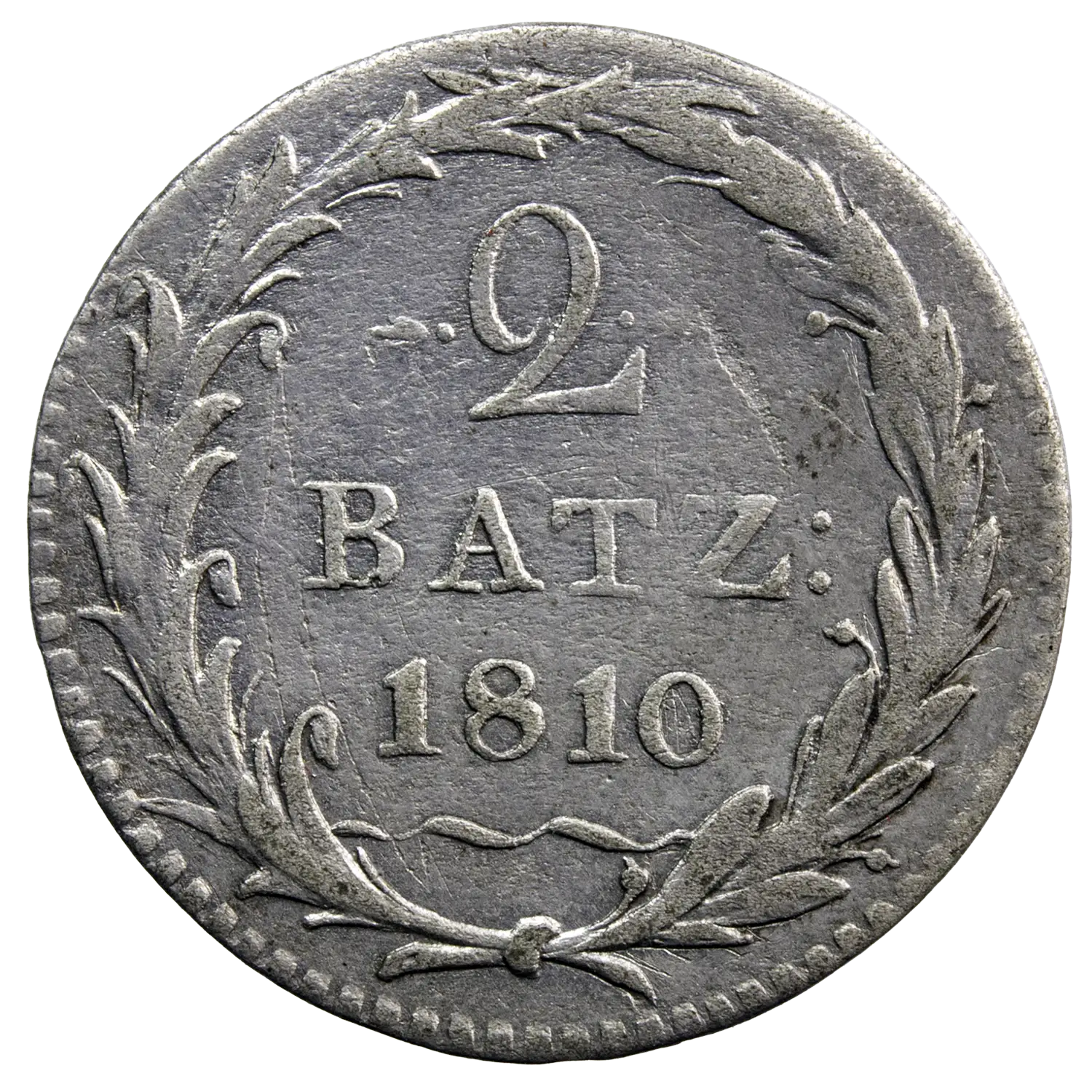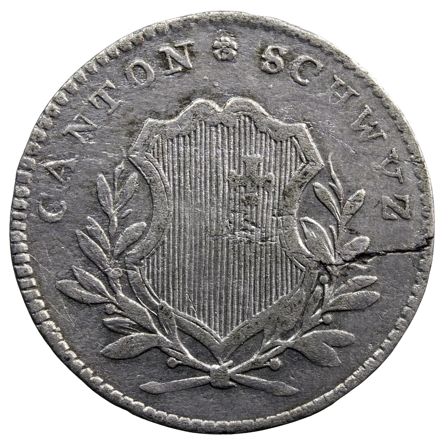 Monnaie Suisse en argent du canton de Schwyz, 2 Batzen 1810 variété avec seulement BATZ au revers. Cassure de flan