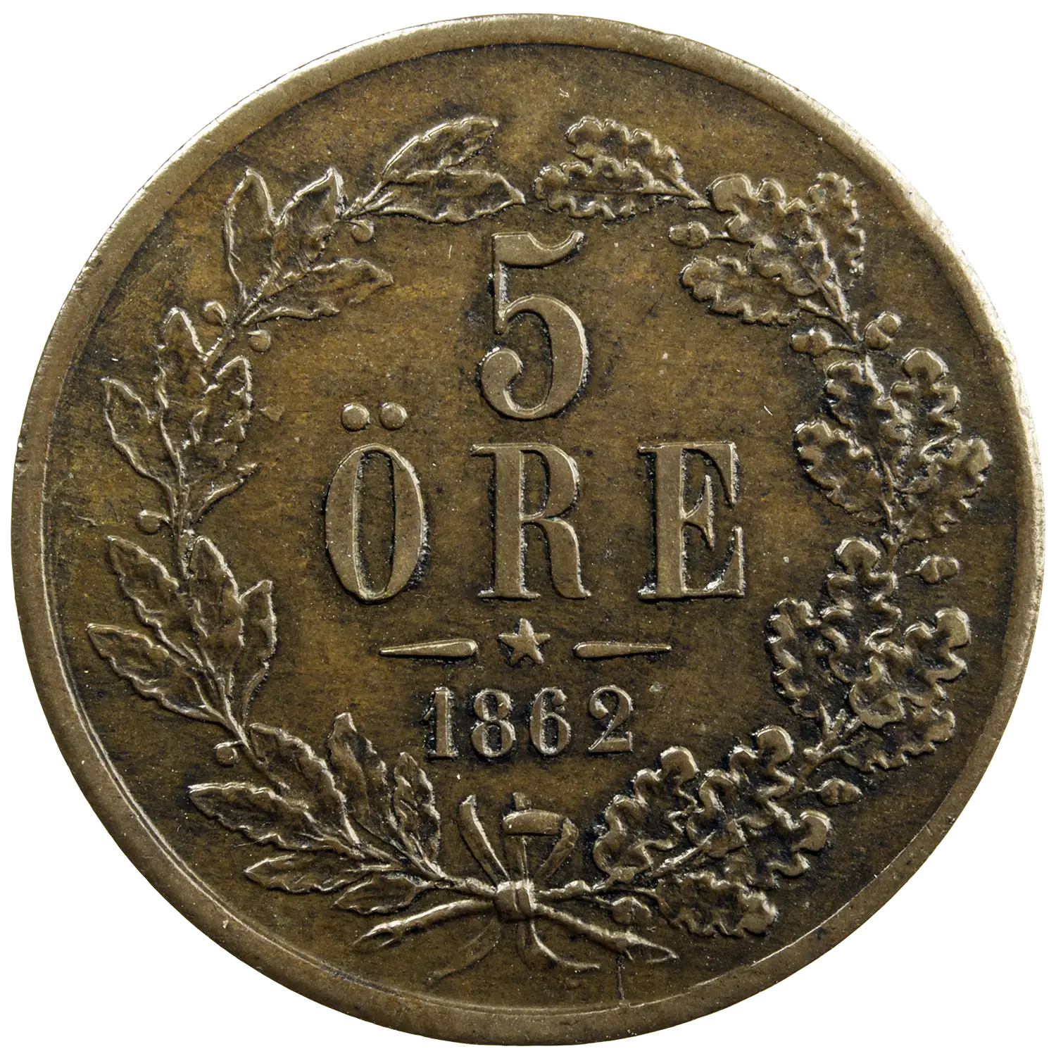 Pièce de 5 ore de Charles V roi de Suède et de Norvège. Monnaie frappée en 1862 dans le quartier de Kungsholmen à Stockholm. Variété avec étoile sous la date