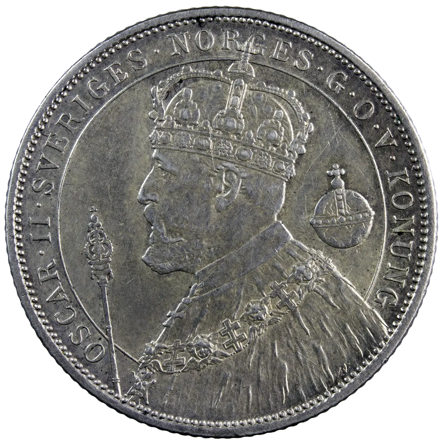 Pièce en argent pour le 25eme anniversaire du règne de Oscar II roi de Suède. Monnaie frappée à 246000 exemplaires en argent à 800 millième