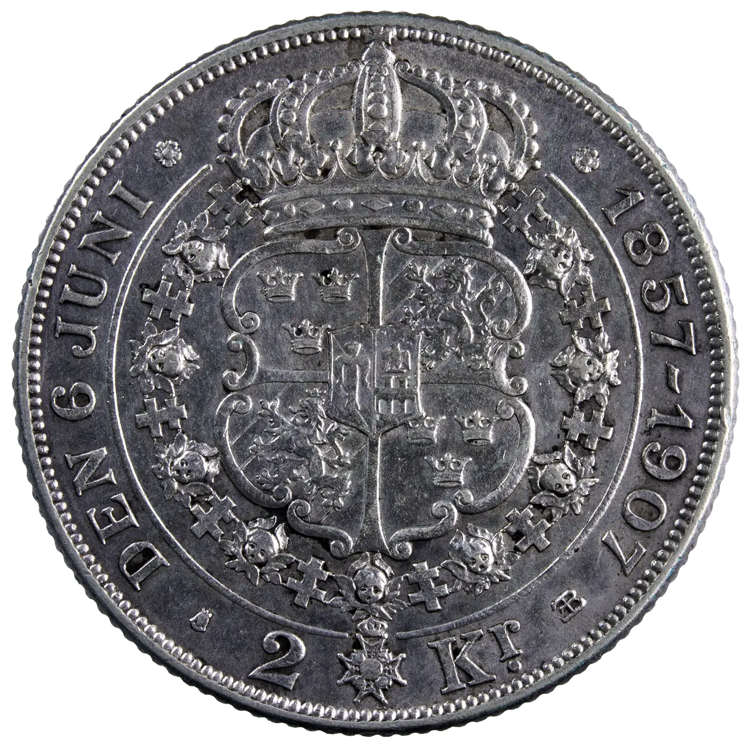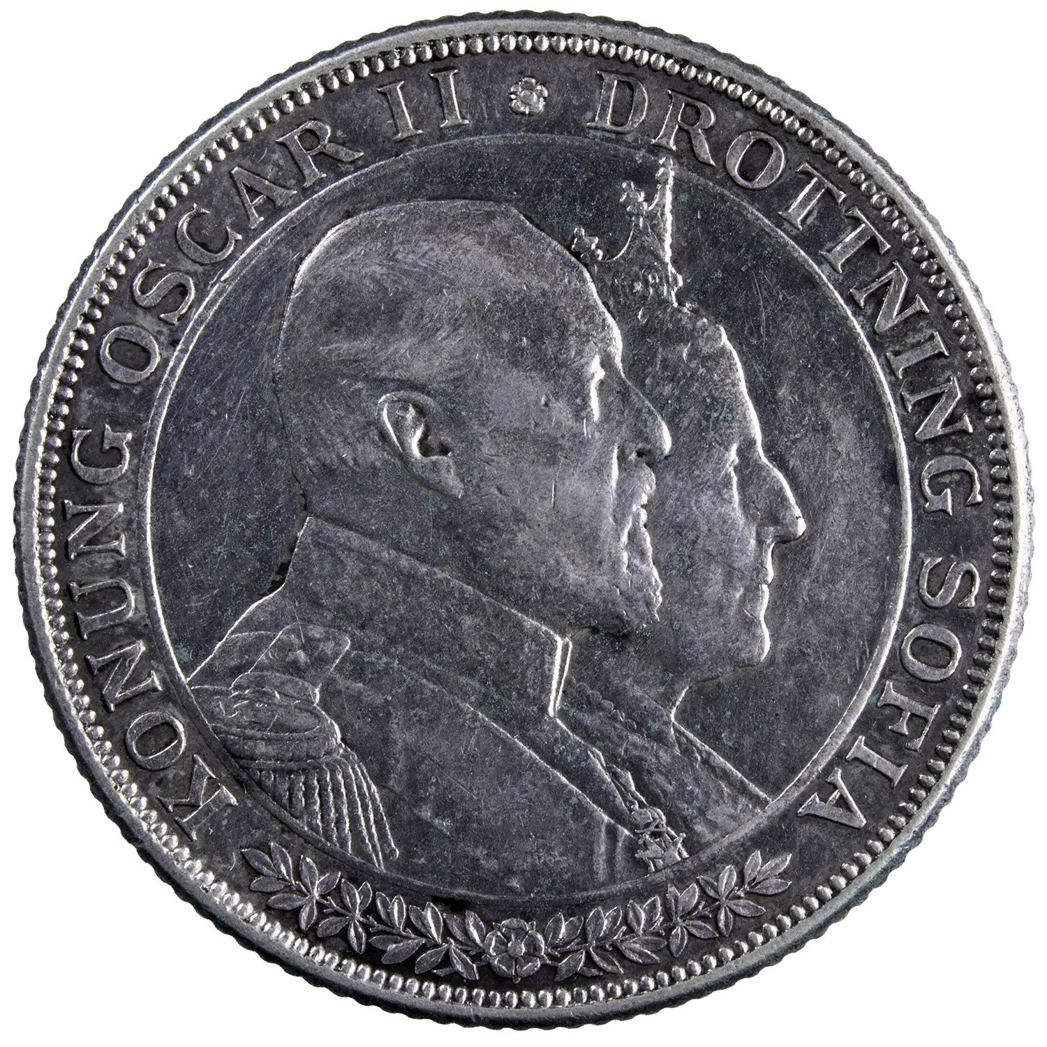 Monnaie commémorative en argent à 800 millième frappé en 1907 pour les noces d’or du roi Oscar II et de la reine Sophie de Nassau. Nettoyée