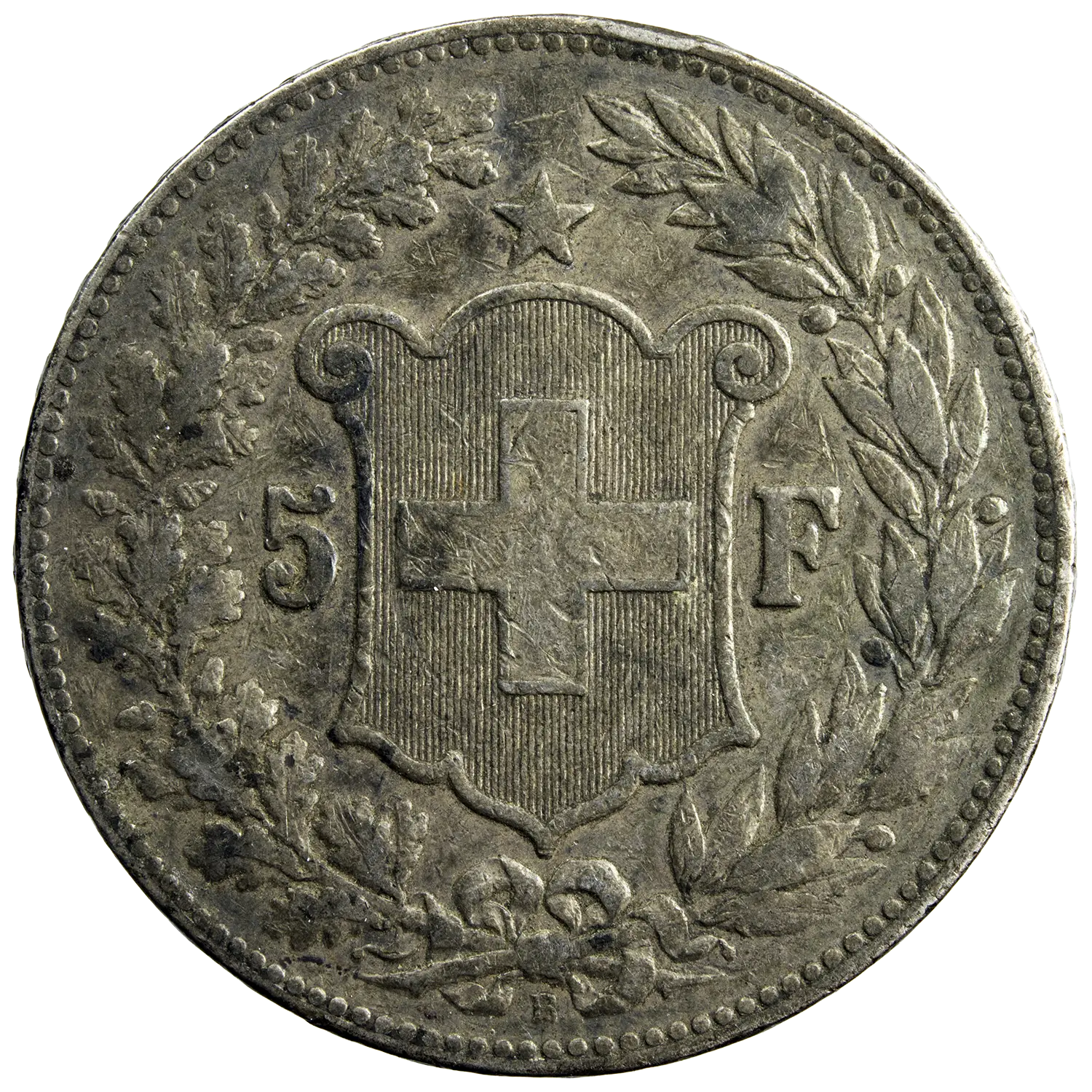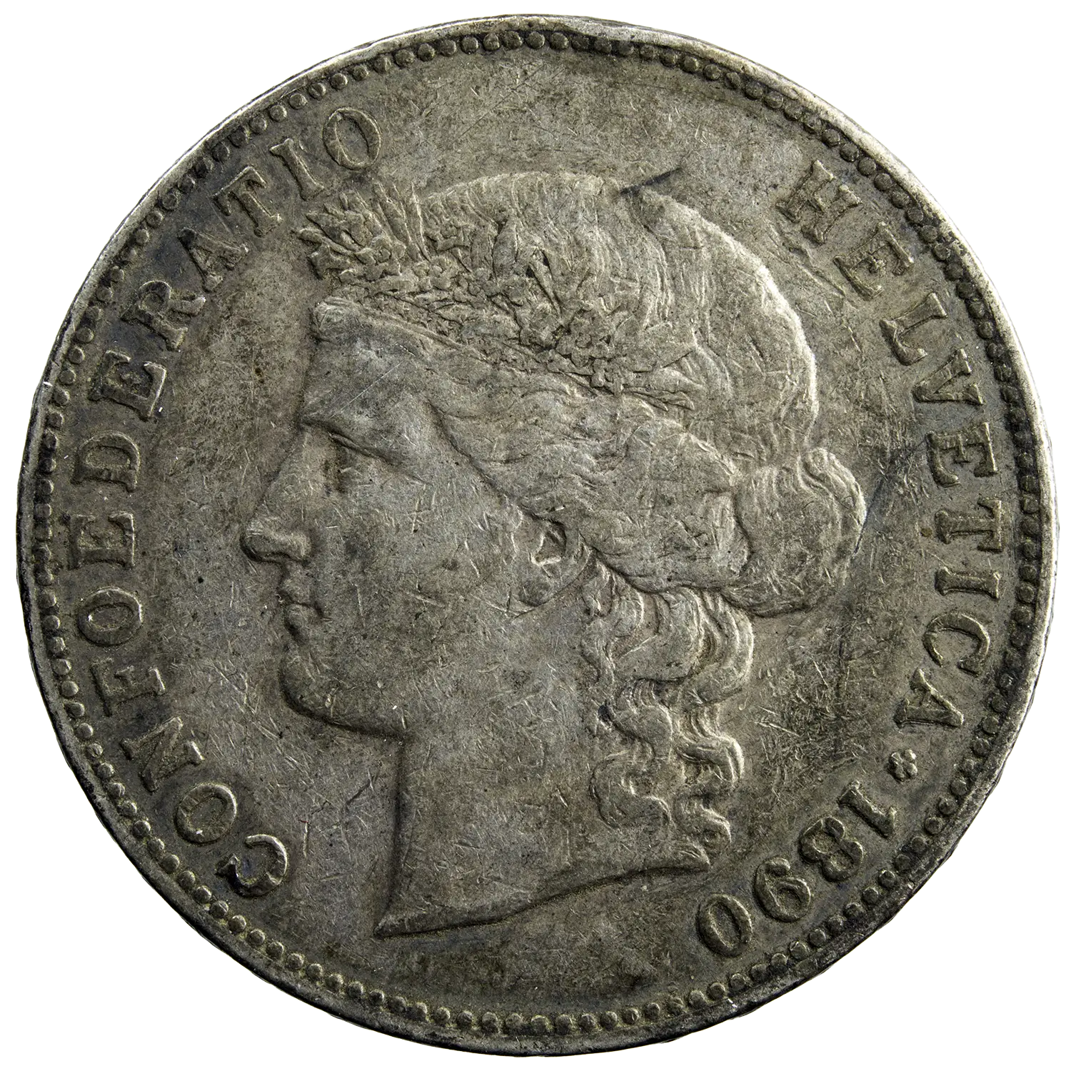 Pièce de 5 francs Suisse en argent, monnaie frappée en 1890 à Berne à 305.000 exemplaires. Tête laurée de la confédération Helvétique à l’avers