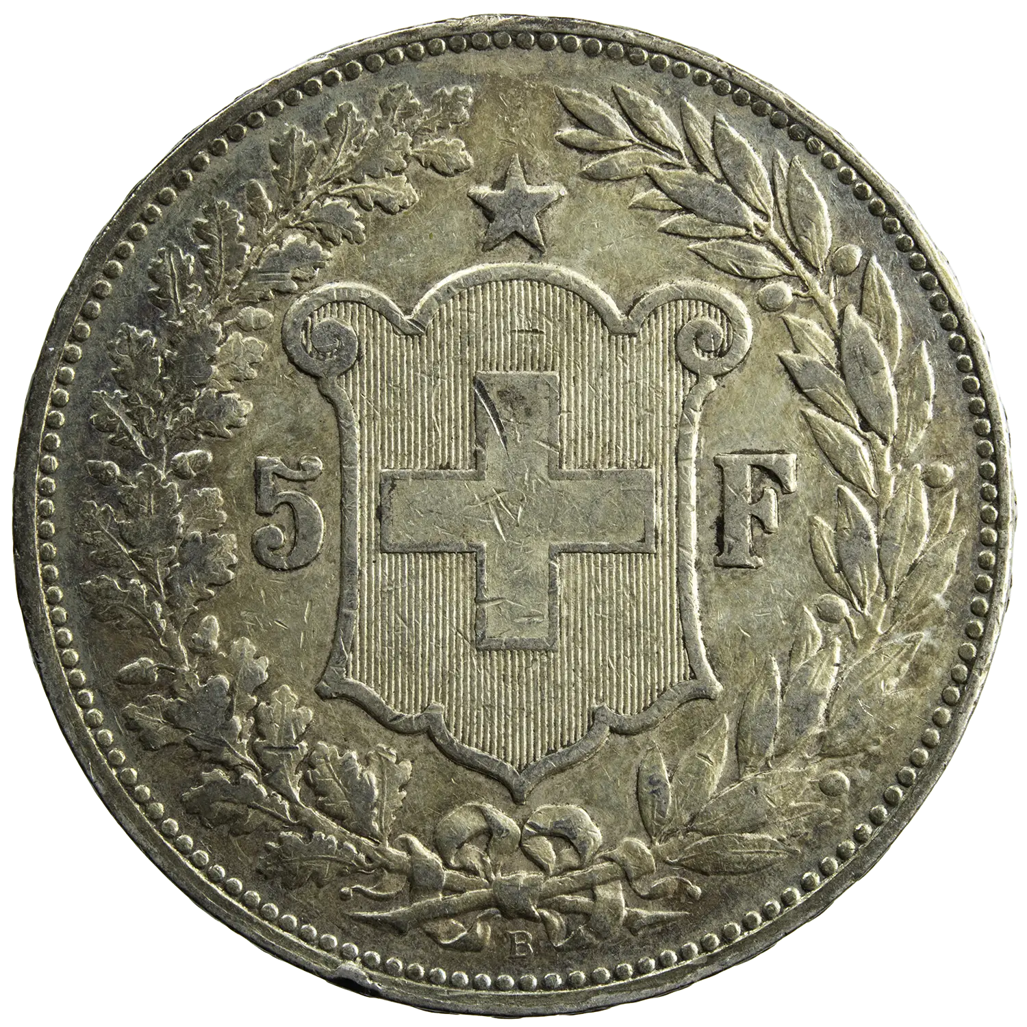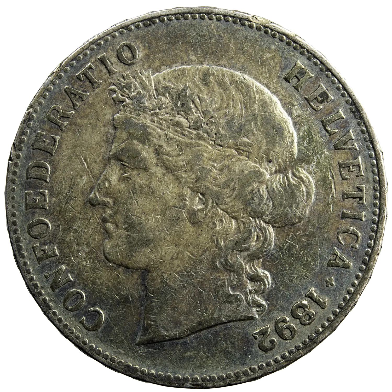 Pièce de 5 francs Suisse en argent, monnaie frappée en 1892 à Berne à 190.000 exemplaires. Tête laurée de la confédération Helvétique à l’avers