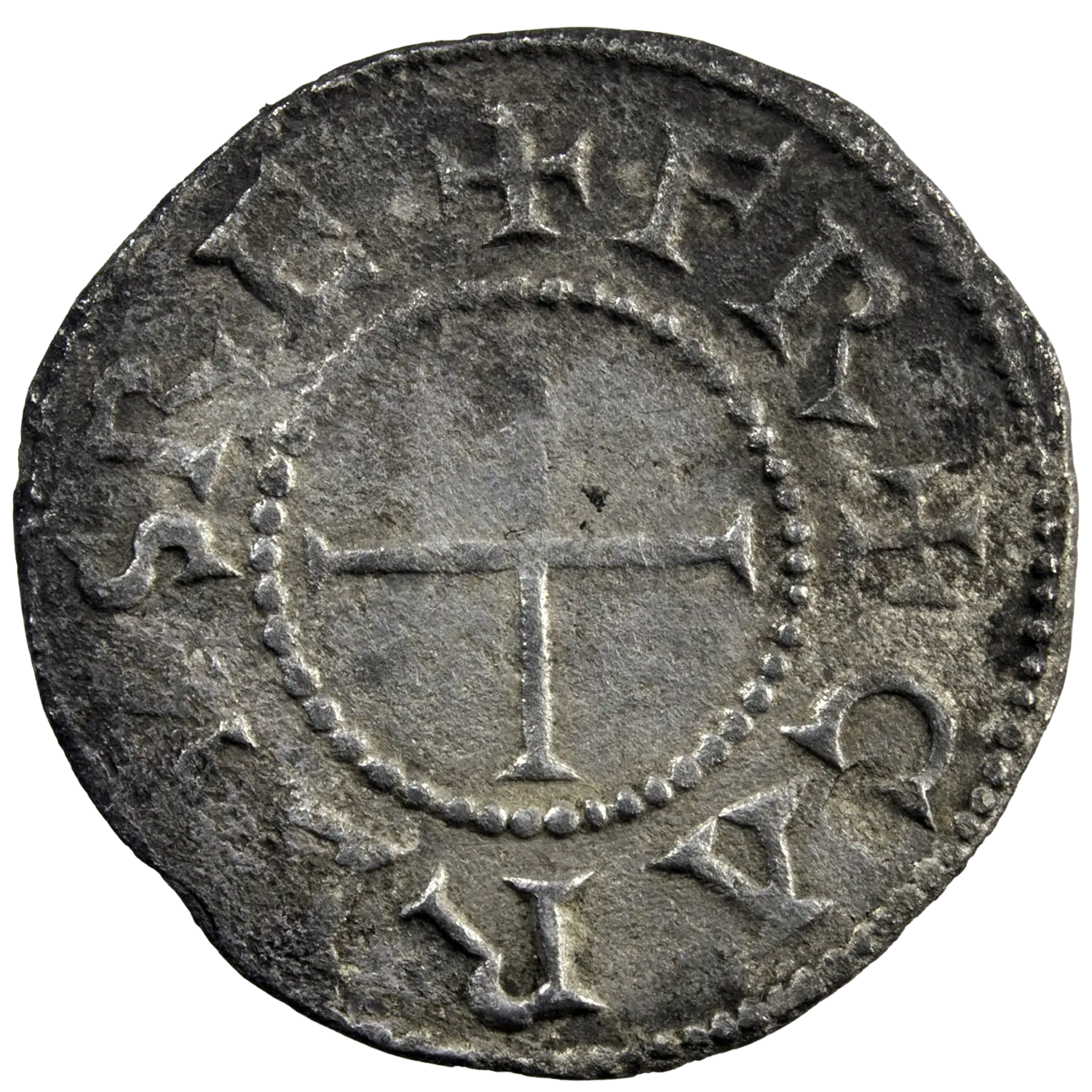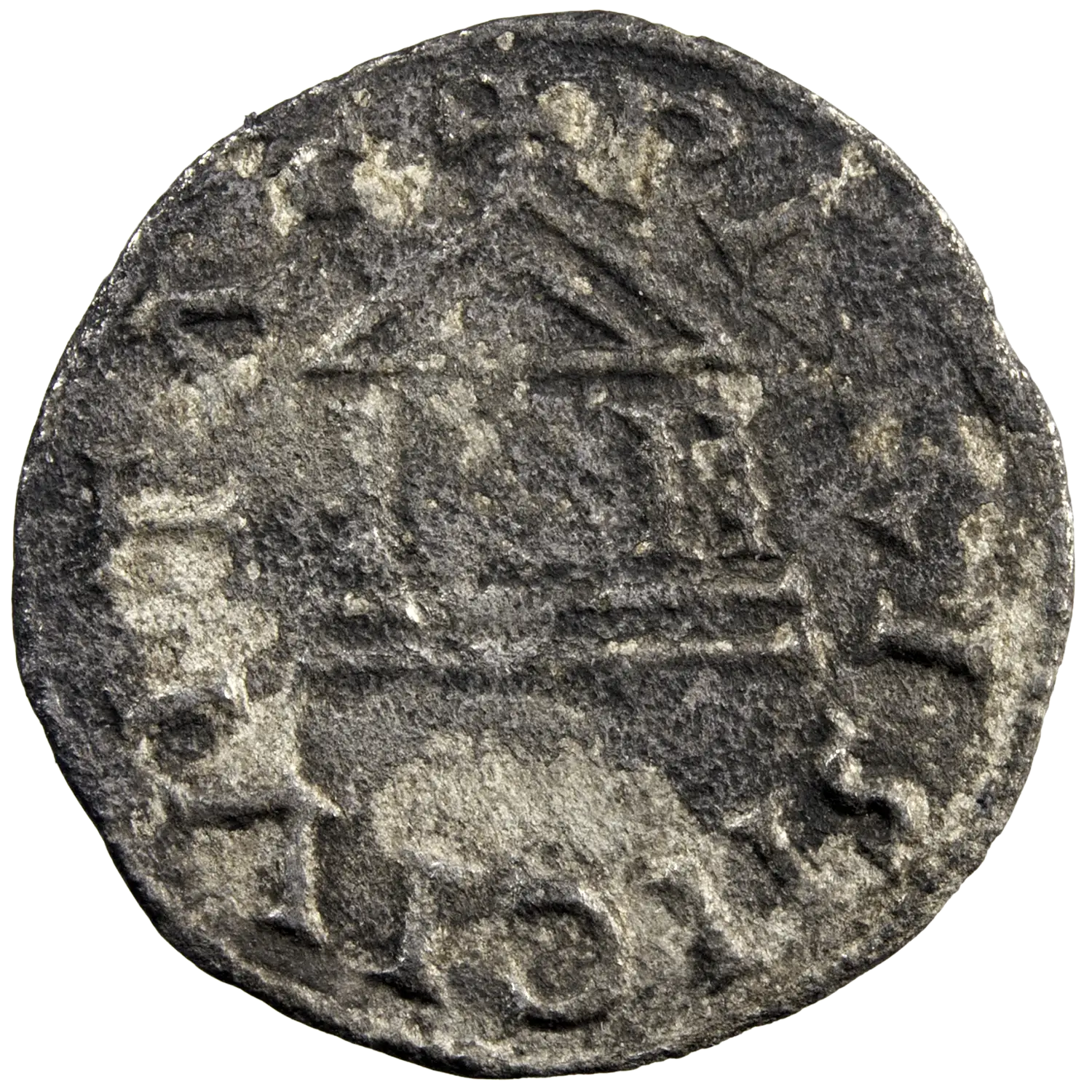 Denier en argent de Charles le Chauve roi des Francs, monnaie au temple frappée vers 840-864 à Paris. Métal cristallisé