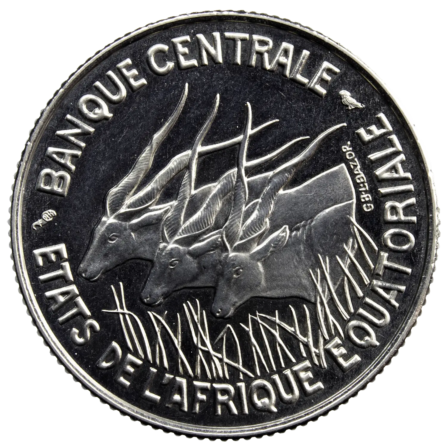 Essai de la pièce de 100 francs en nickel frappé à la monnaie de Paris en 1966 pour la Banque Centrale des États de l’Afrique équatoriale. Trois antilopes au revers
