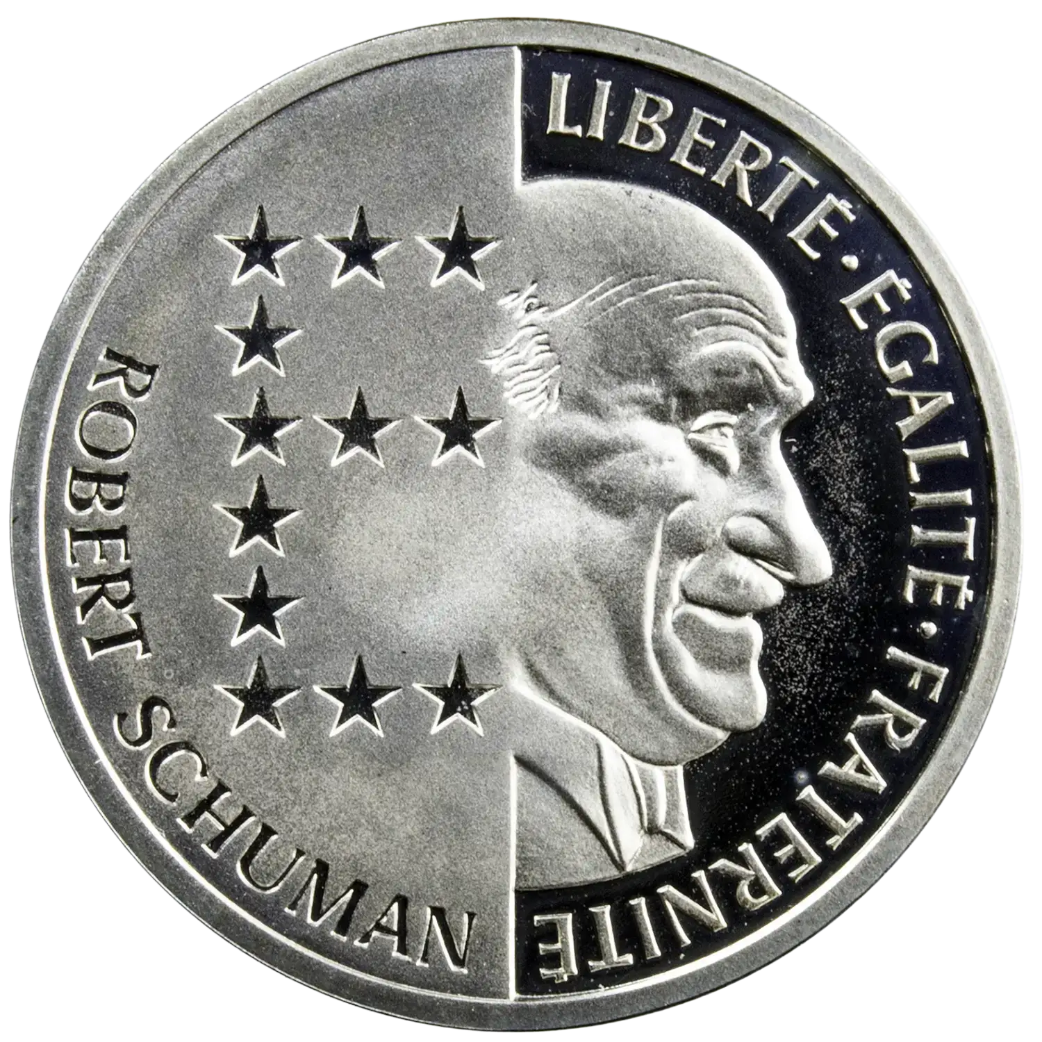 Epreuve en argent de la 10 francs Schuman père de l’Europe frappée en 1986. Tranche lisse, 6000 exemplaires frappés.