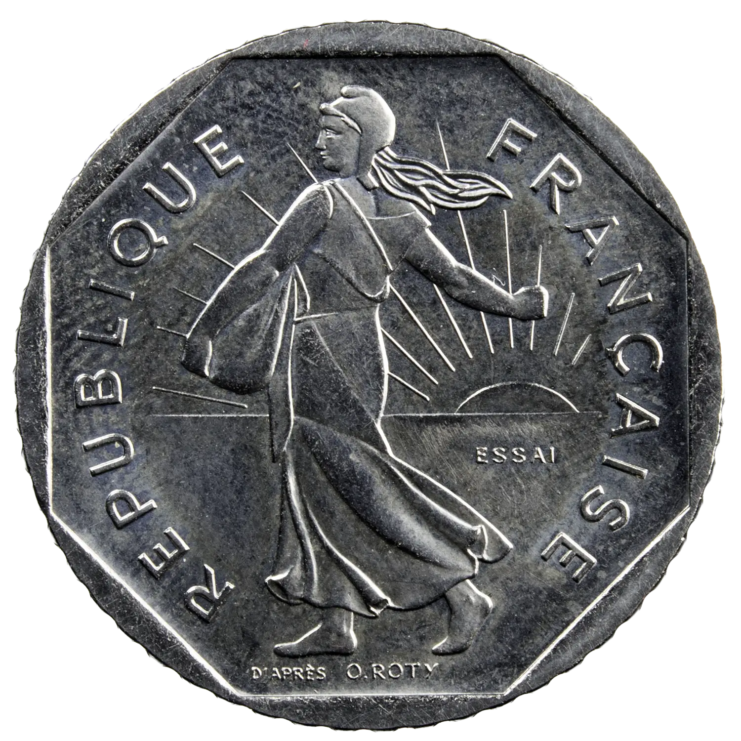 Pièce d’essai frappée durant le cinquième république à Pessac en 1978. Essai de 2 francs frappé à 6000 exemplaires. Mot ESSAI au revers