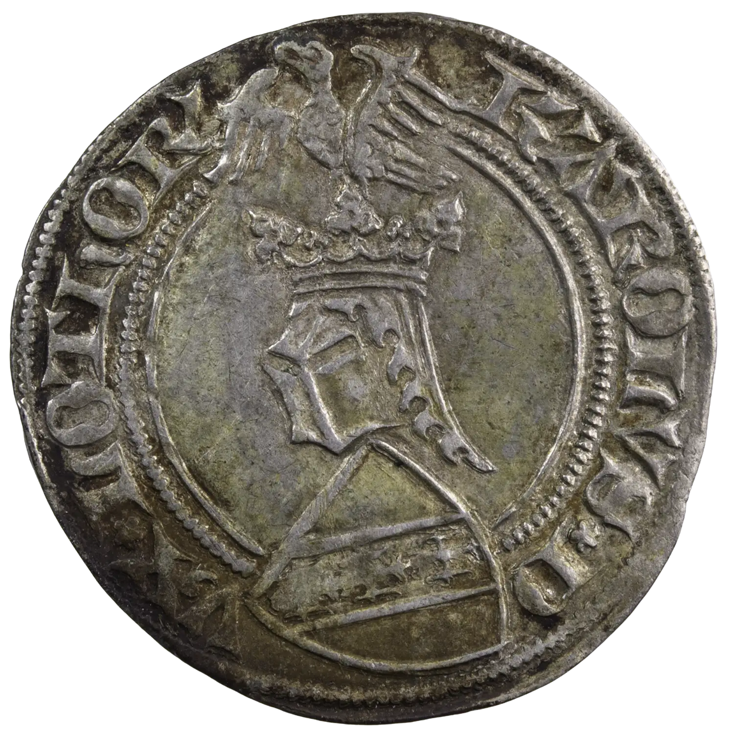 Gros en argent frappé à Sierck les bains sous Charles II duc de Lorraine, monnaie frappée vers 1390-1430. Heaume couronné sommé d’un aigle et sur un écu de Lorraine penché. Monnaie légèrement voilée