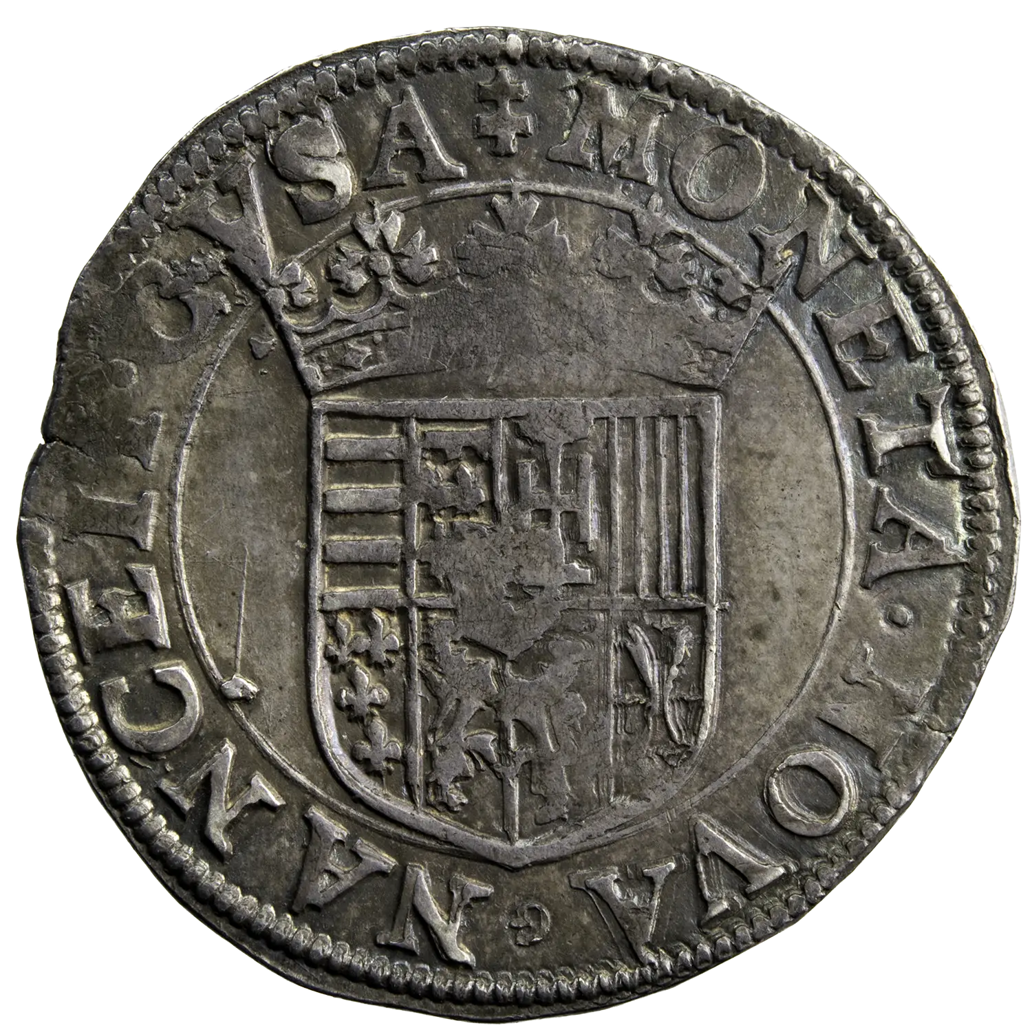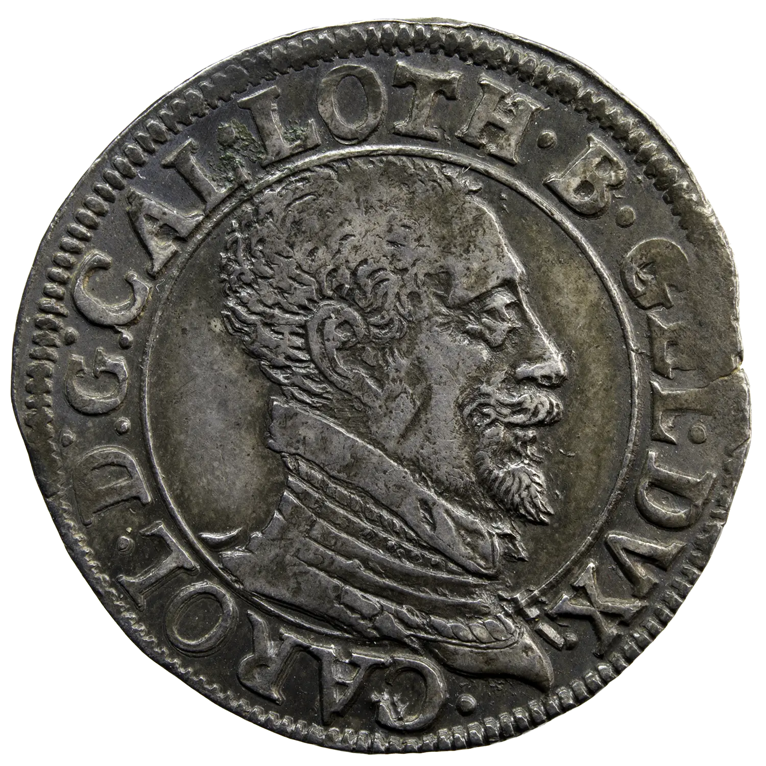 Teston en argent de Charles III duc de Lorraine, frappé à Nancy vers 1581-1608, avec le différent G du maître Nicolas Gennetaire. Très belle patine au reflet bleutée