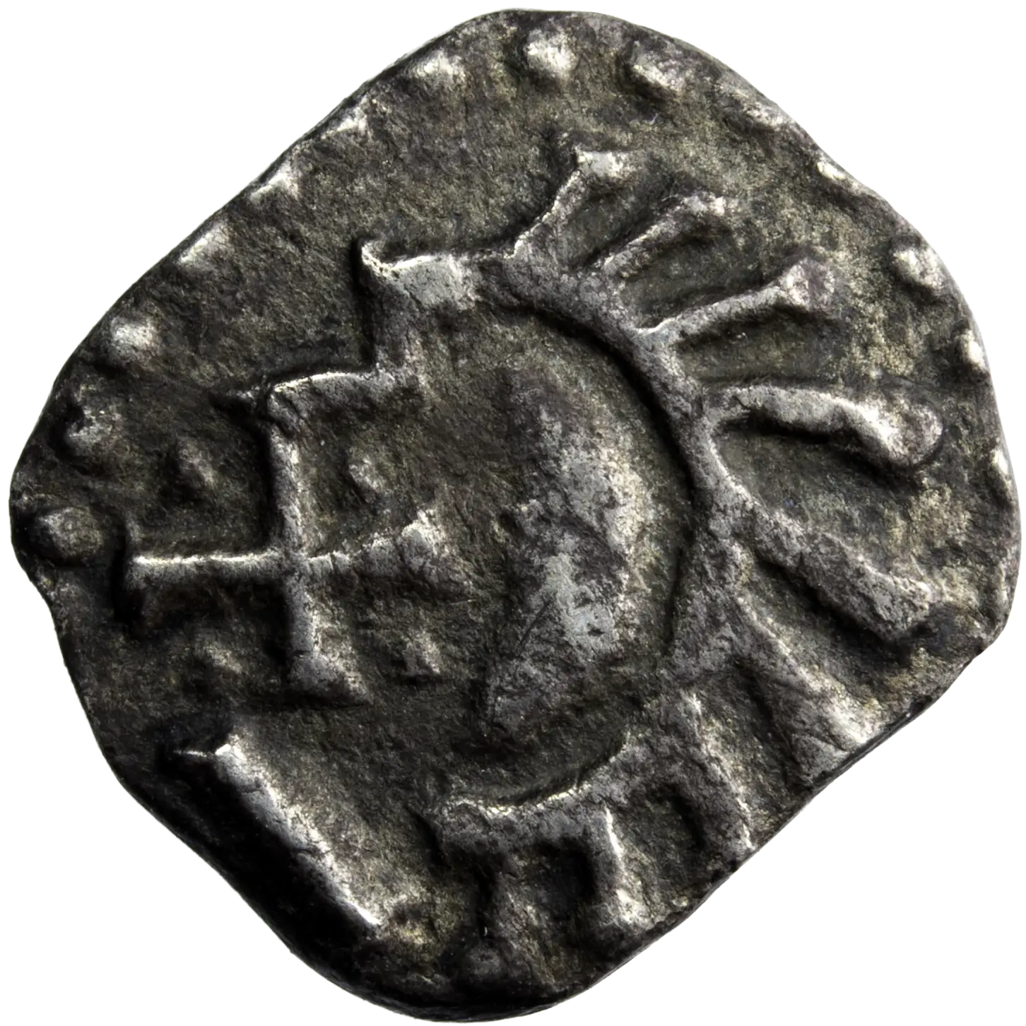 Ces deniers anciennement attribués à Marseille seraient issus d’un atelier indéterminé situé le long de la vallée du Rhône. Tête Stylisé à gauche avec une croisette devant à l’avers et Croix ancrée, cantonnée aux 1 et 3 d’un globule, au 3 d’un V, au 4 d’un II.