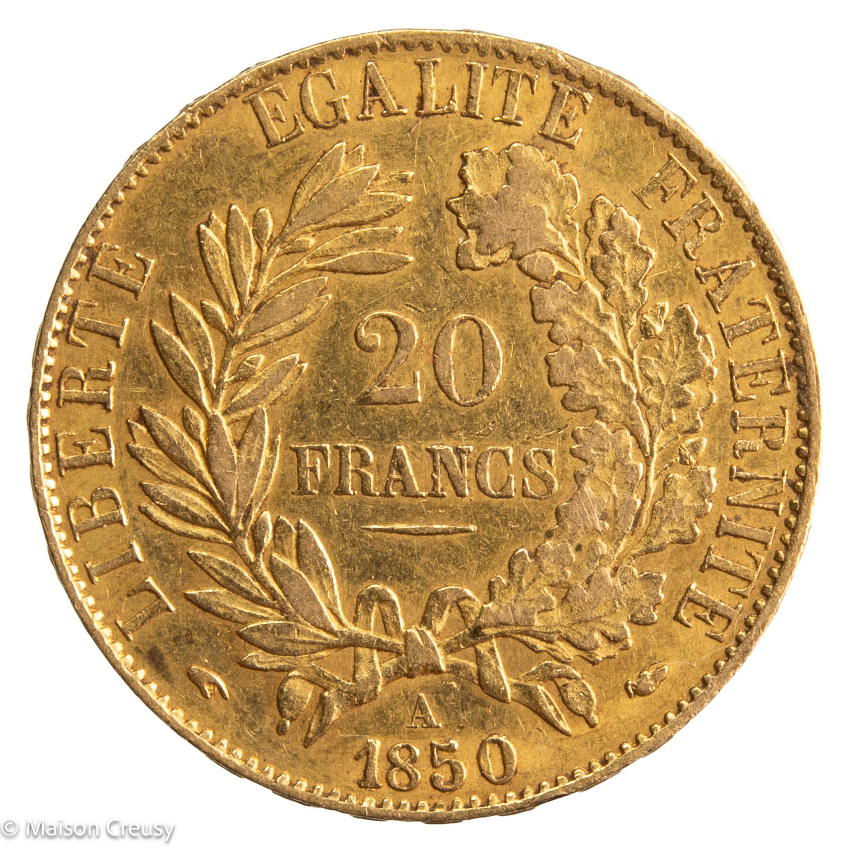 20 francs or de type Ceres, frappé durant la seconde république en 1850 à Paris. Variété avec l’oreille basse.