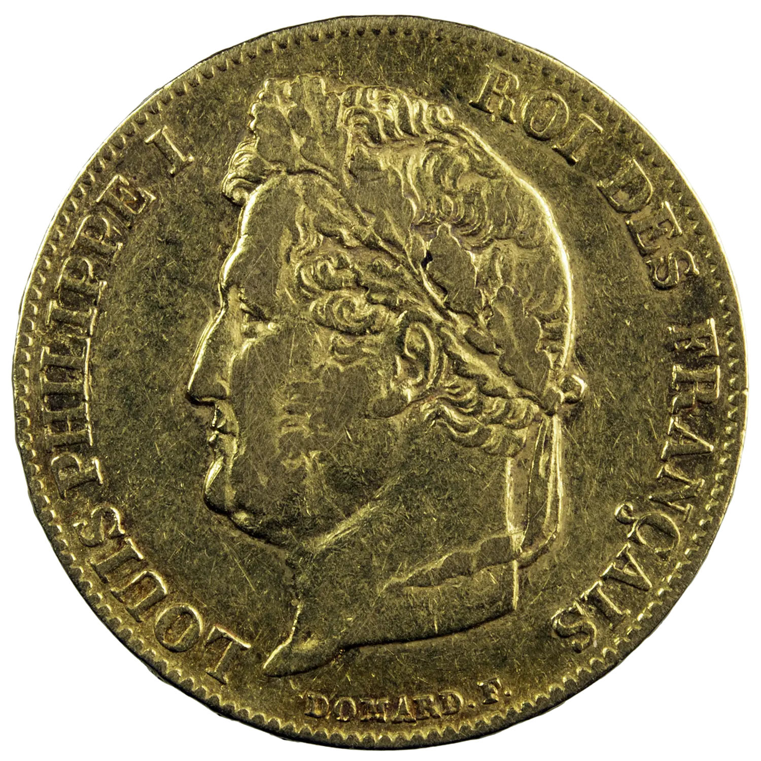 Pièce de 20 francs or de Louis Philippe roi des français. Monnaie frappée en 1840 à Paris. Tête laurée de Louis Philippe à gauche