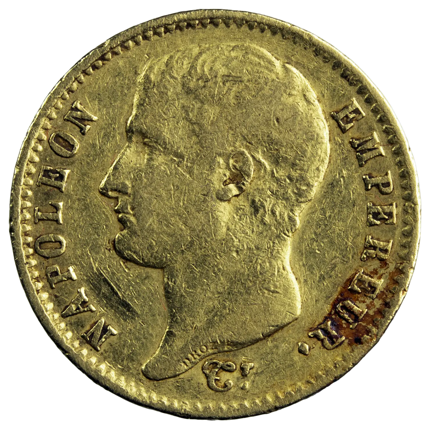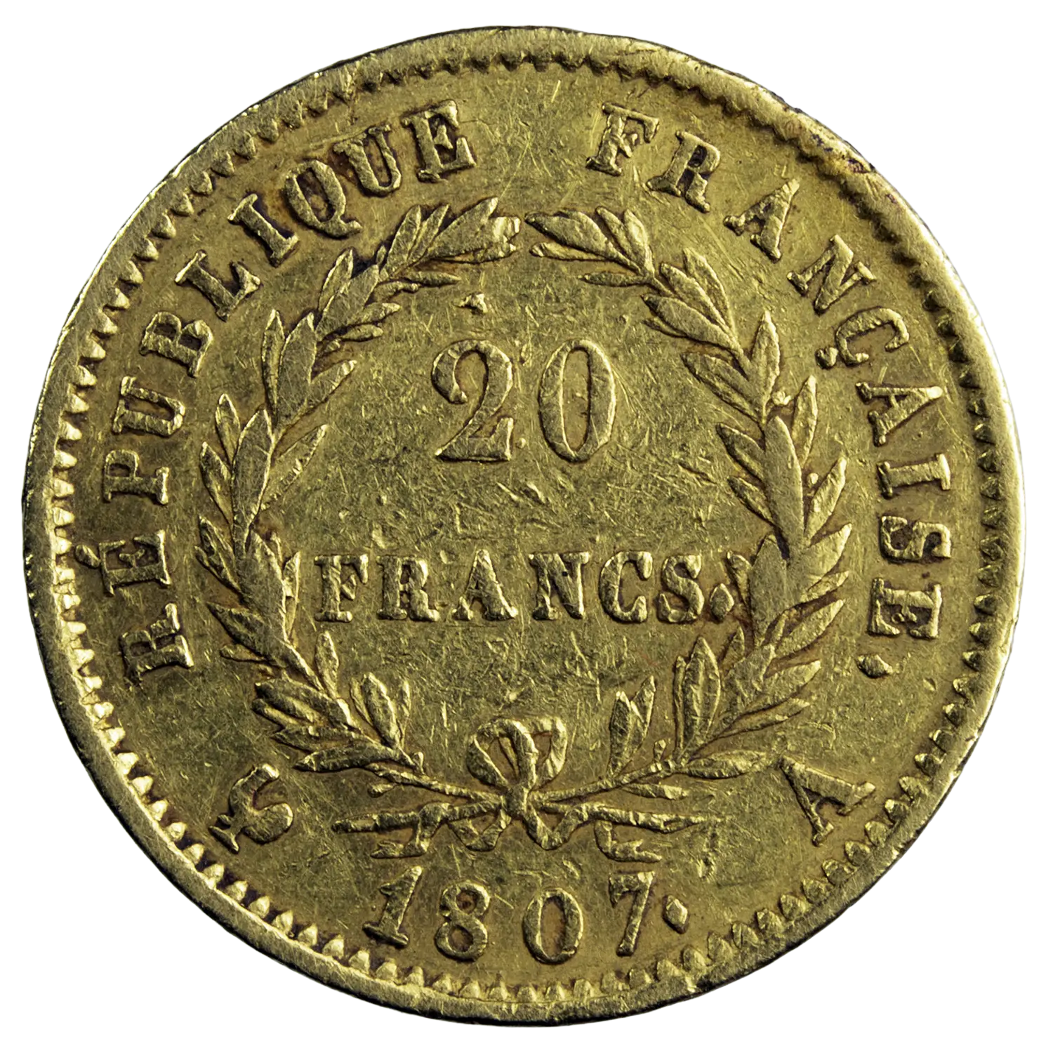 Pièce de 20 francs or de Napoléon I empereur, monnaie frappée en 1807 à Paris, il existe deux types pour 1807 celui ci à la tête nue.