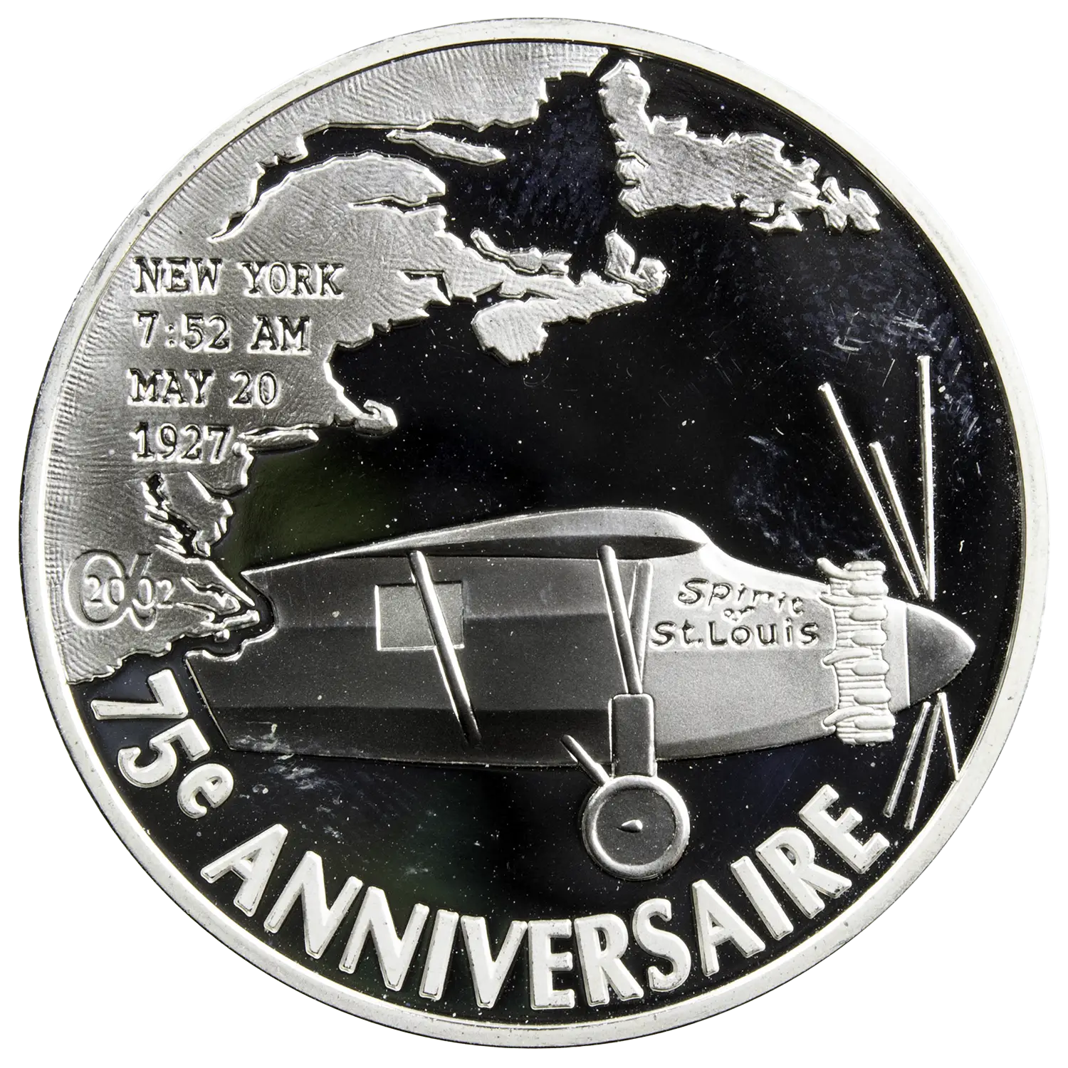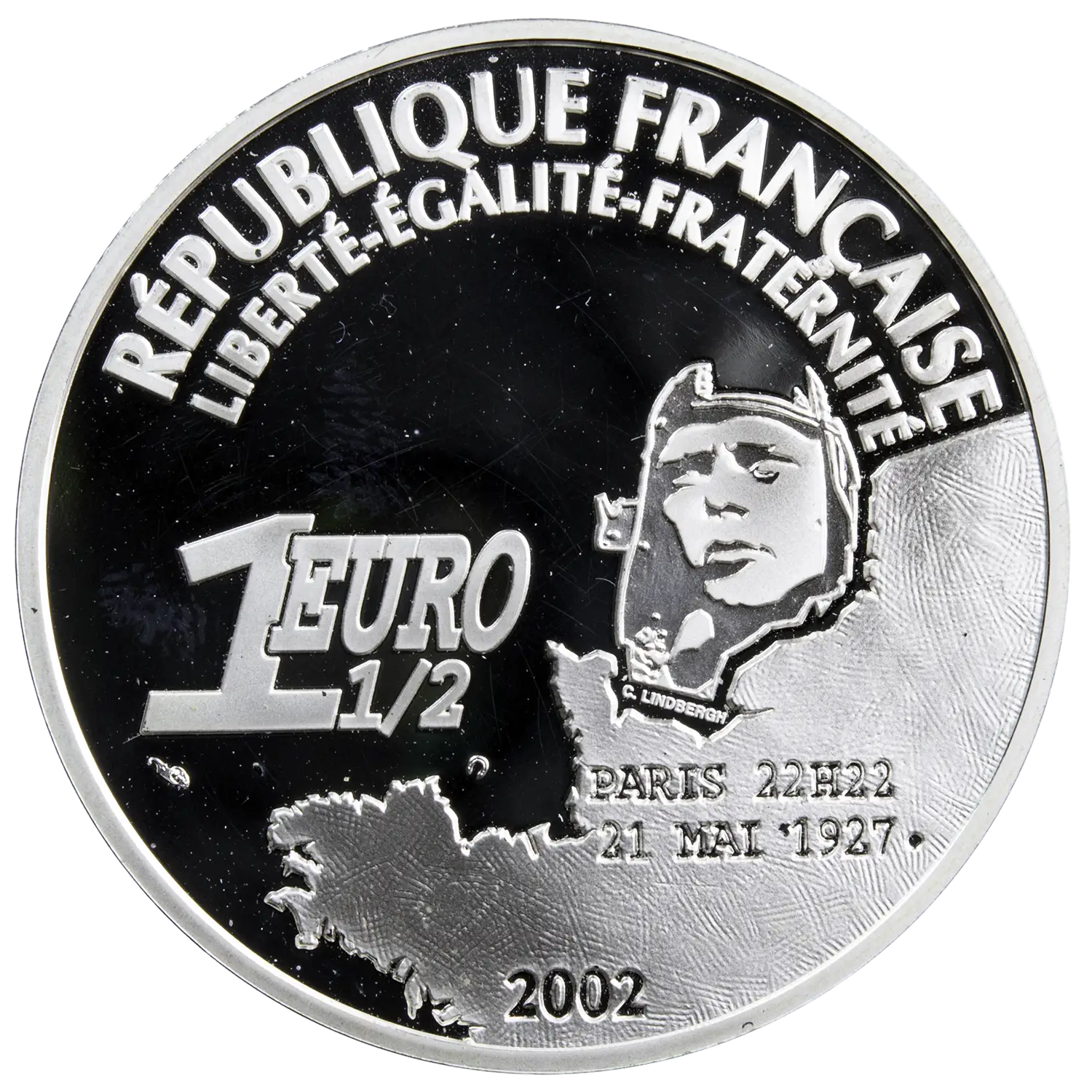 Monnaie en argent commémorative de 1,5 euro frappée en 2002 à Pessac. Seulement 10000 exemplaires frappés. Commémore la traversé de l’Atlantique en avion par Lindbergh à bord du Spirit of Saint Louis