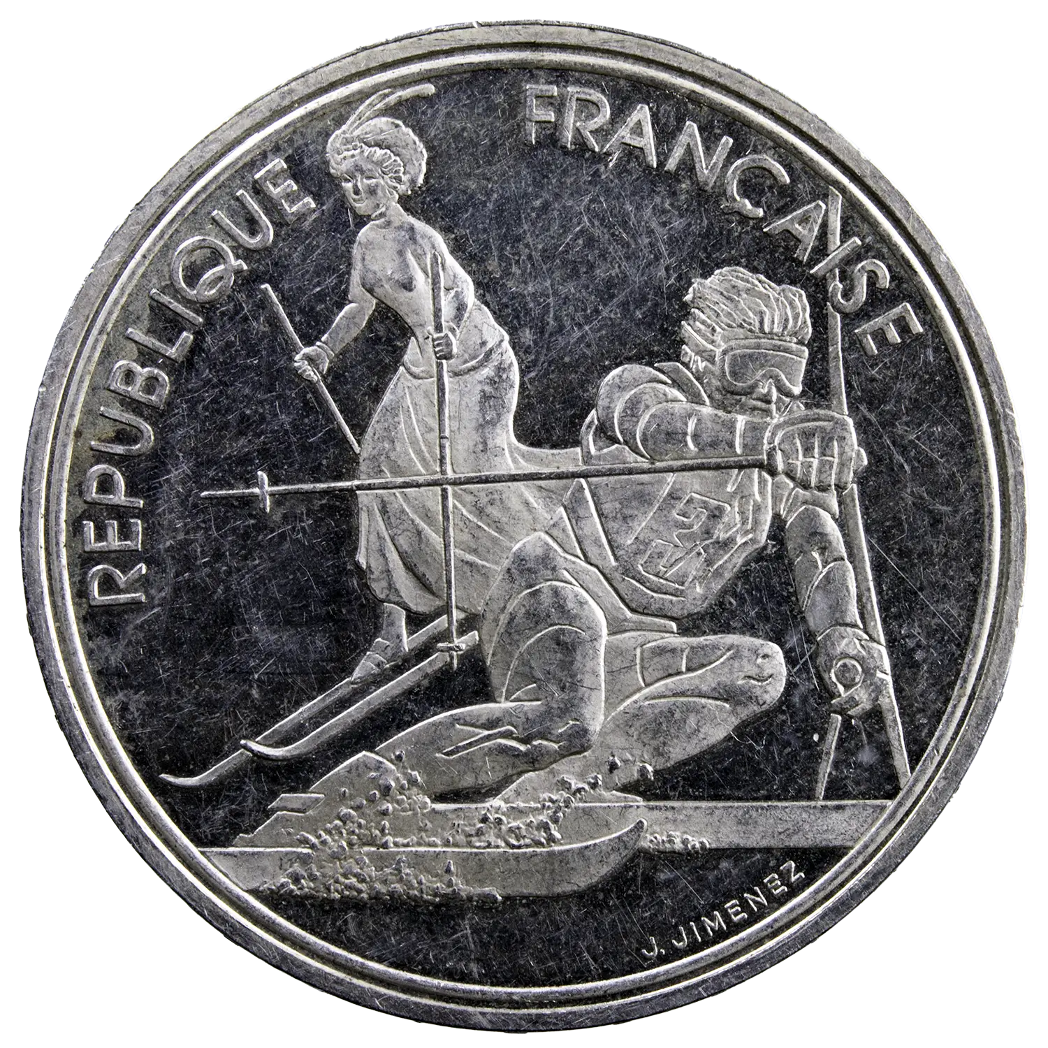 Pièce commémorative en argent de 100 francs frappée pour les Jeux Olympiques d’Albertville de 1992. Au revers l’épreuve de Slalom. Seulement 1850 exemplaires frappés