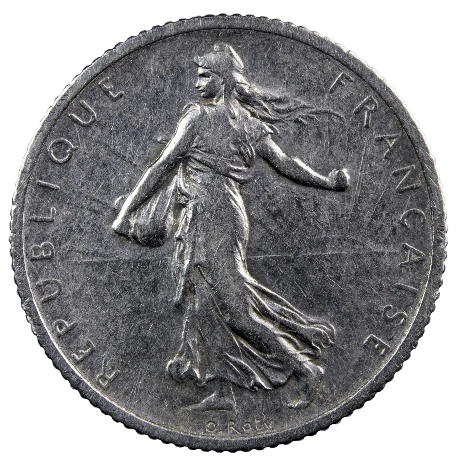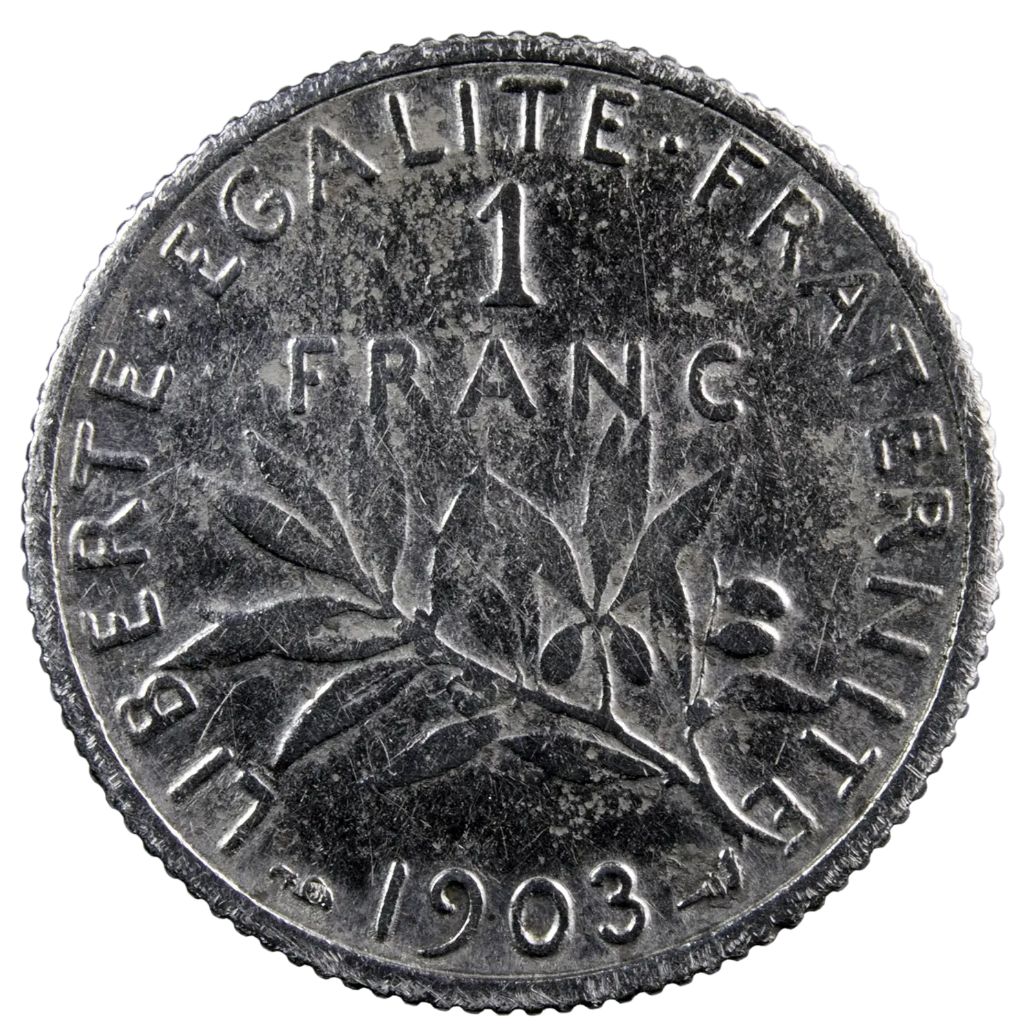 Pièce de 1 franc semeuse en argent, monnaie frappée en 1903 à Paris. Troisième plus faible tirage après 1914 C et 1900 avec 472.883 exemplaires frappés.