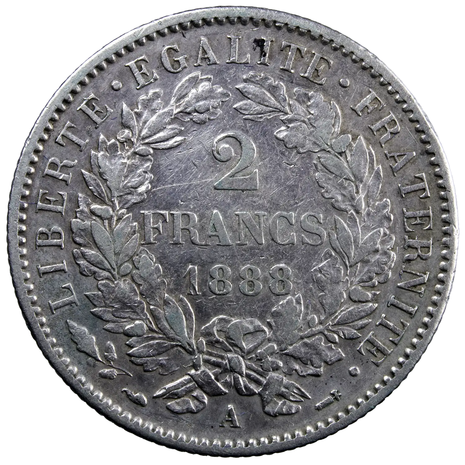 Pièce en argent de 2 francs frappée durant la Troisième république française en 1888 à Paris. Seulement 130501 exemplaires frappés