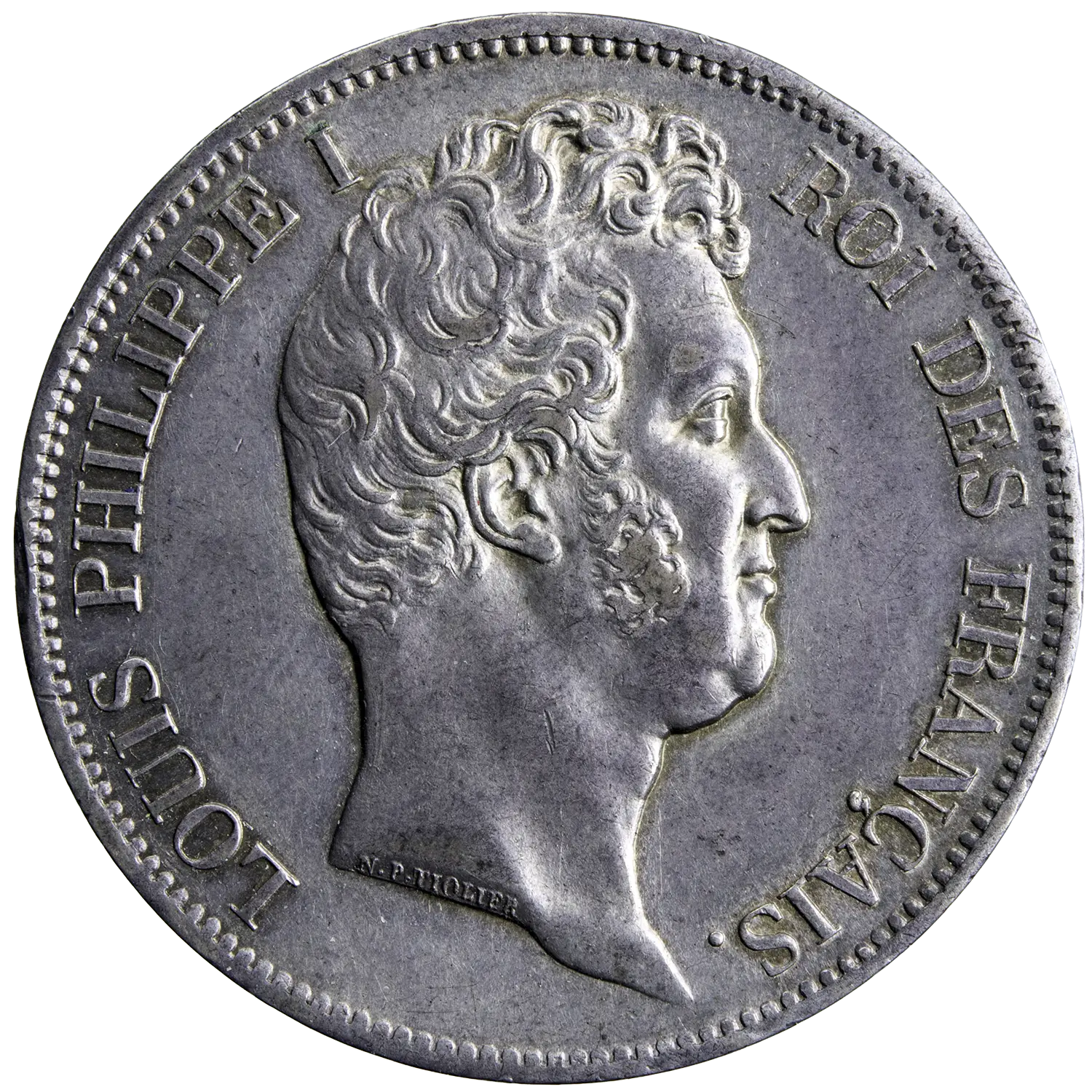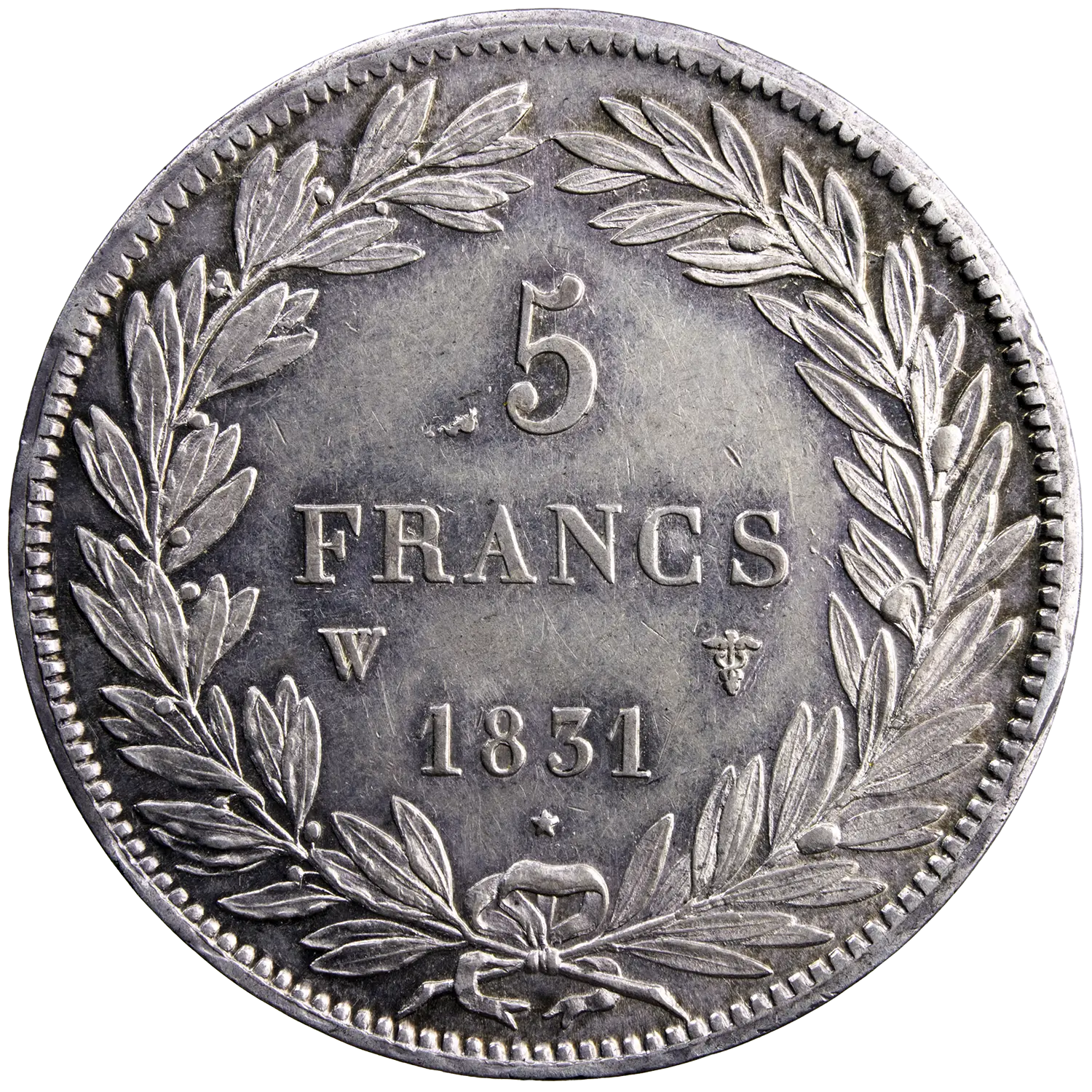 Pièce en argent de 5 francs de Louis Philippe tête nue type Tiolier avec la tranche creux, monnaie frappée en 1831 à Lille (W)