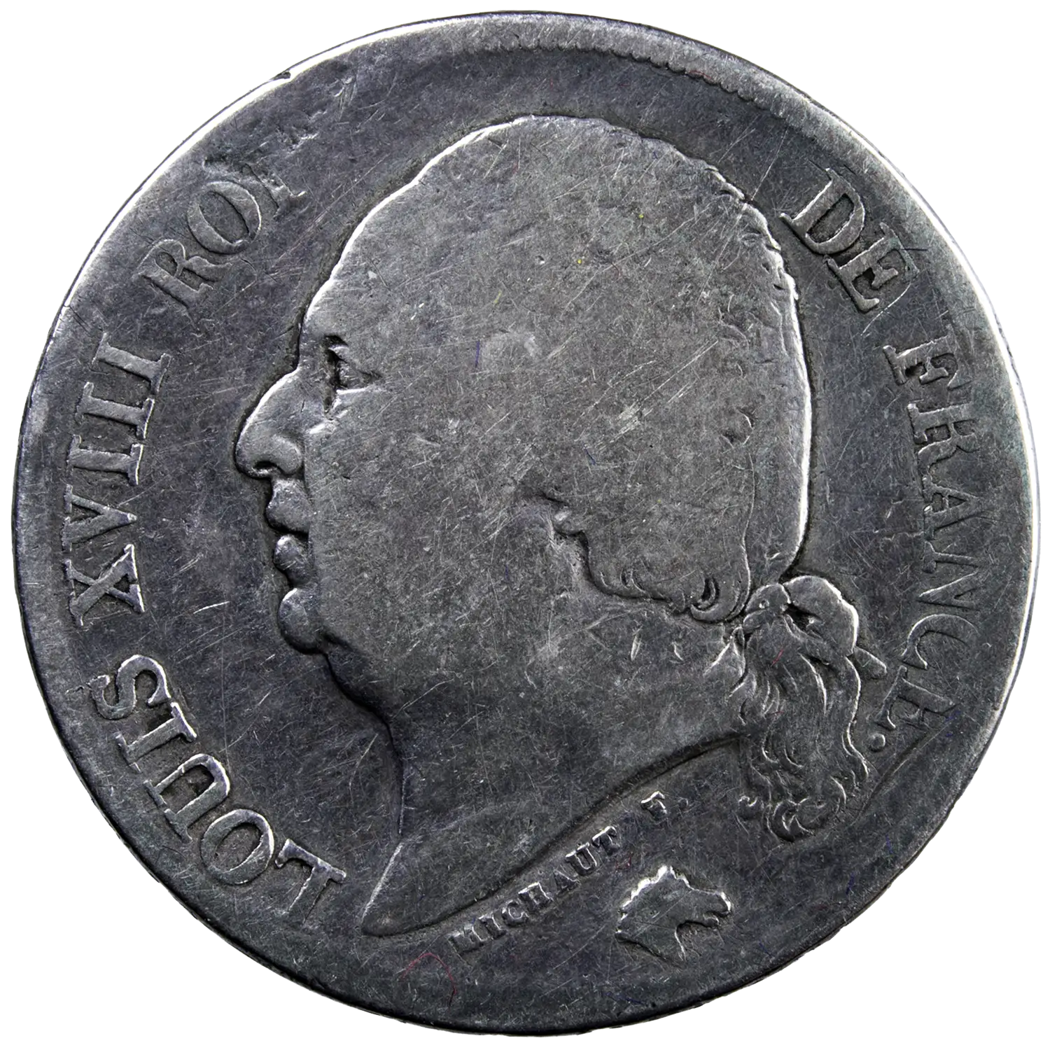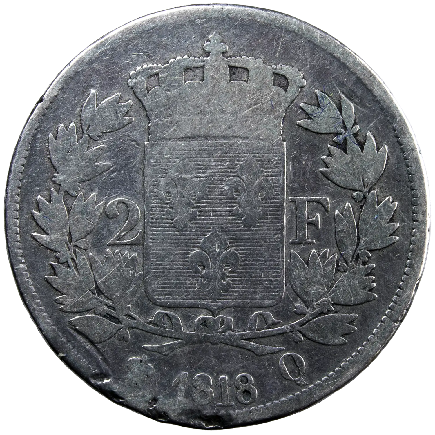 Pièce en argent de 2 francs de Louis XVIII roi de France, monnaie frappée en 1818 à Perpignan lettre d’atelier Q. Seulement 52011 exemplaires frappés.