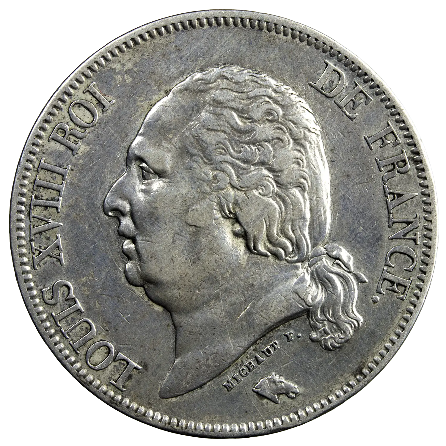Monnaie de 5 francs de Louis XVIII roi de France, monnaie frappée en 1824 à La Rochelle. Pièce ayant un brillant artificielle lié à un nettoyage chimique.
