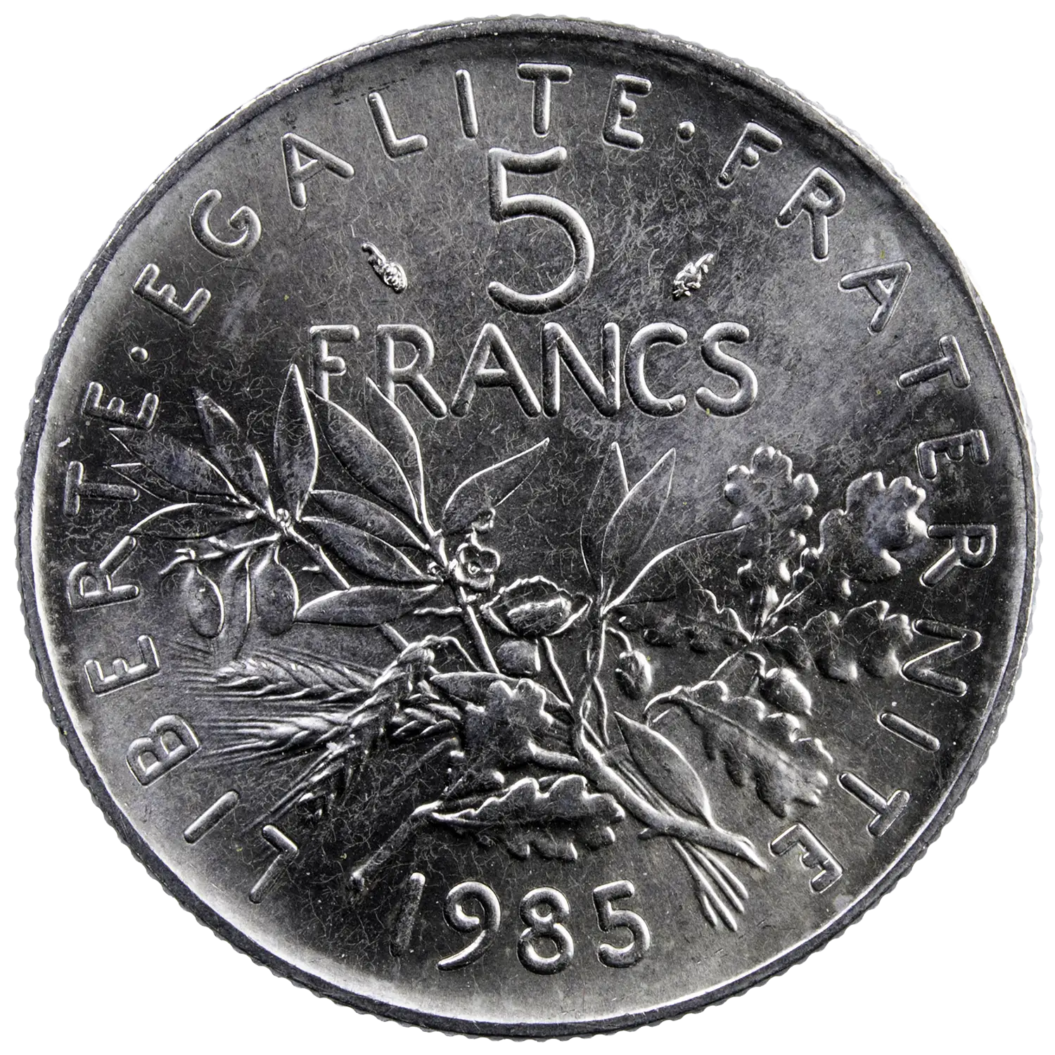 Pièce de 5 francs en nickel type à la semeuse, monnaie frappée à Pessac en 1985 à seulement 20.111 exemplaires sur plus de 465 millions de 5 francs semeuse en nickel