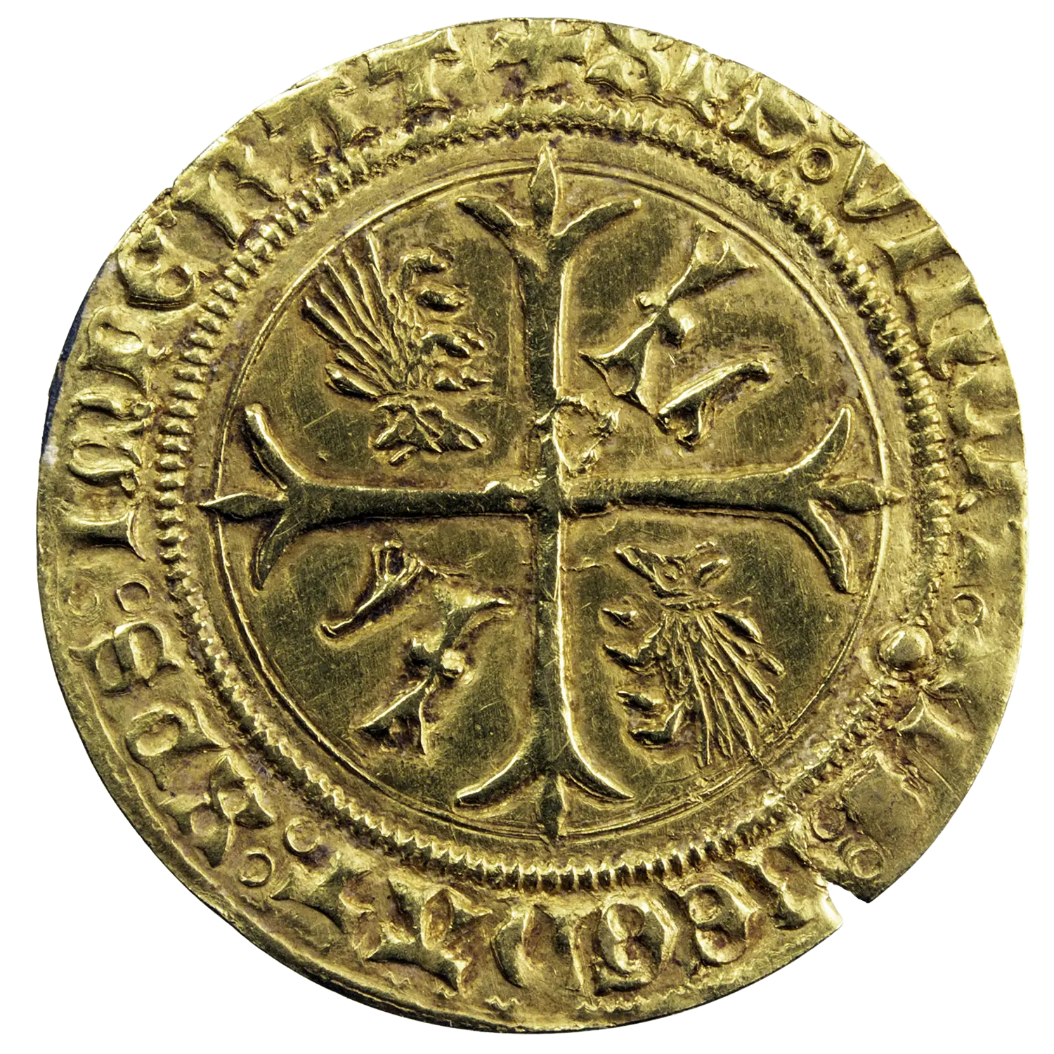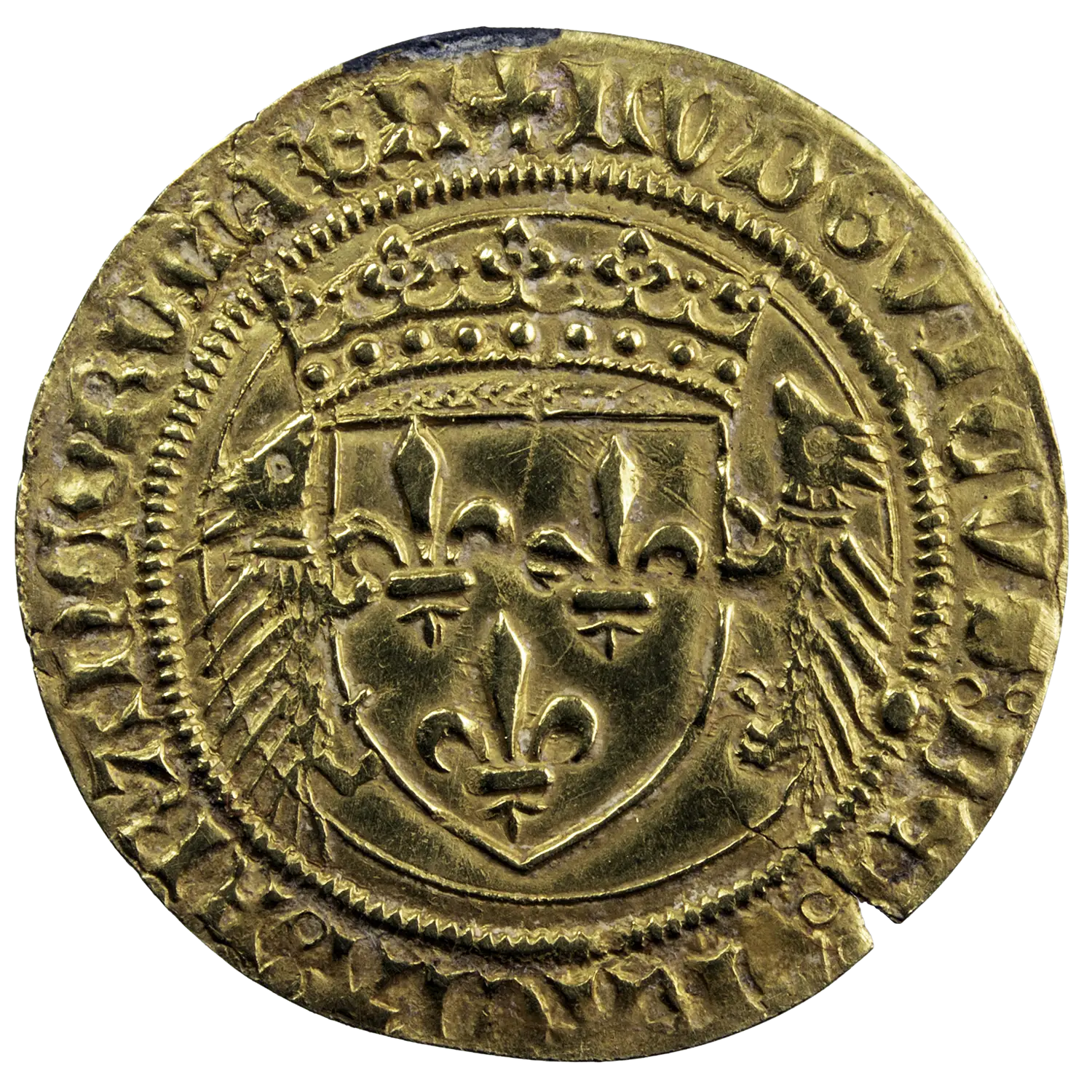 Très rare écu d’or au porc-épic de Louis XII roi de France, monnaie frappée à Limoges point sous la 10ème lettre de la légende. Monnaie classé R4 dans le Gadoury. Flan fissuré à 4h.