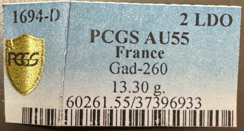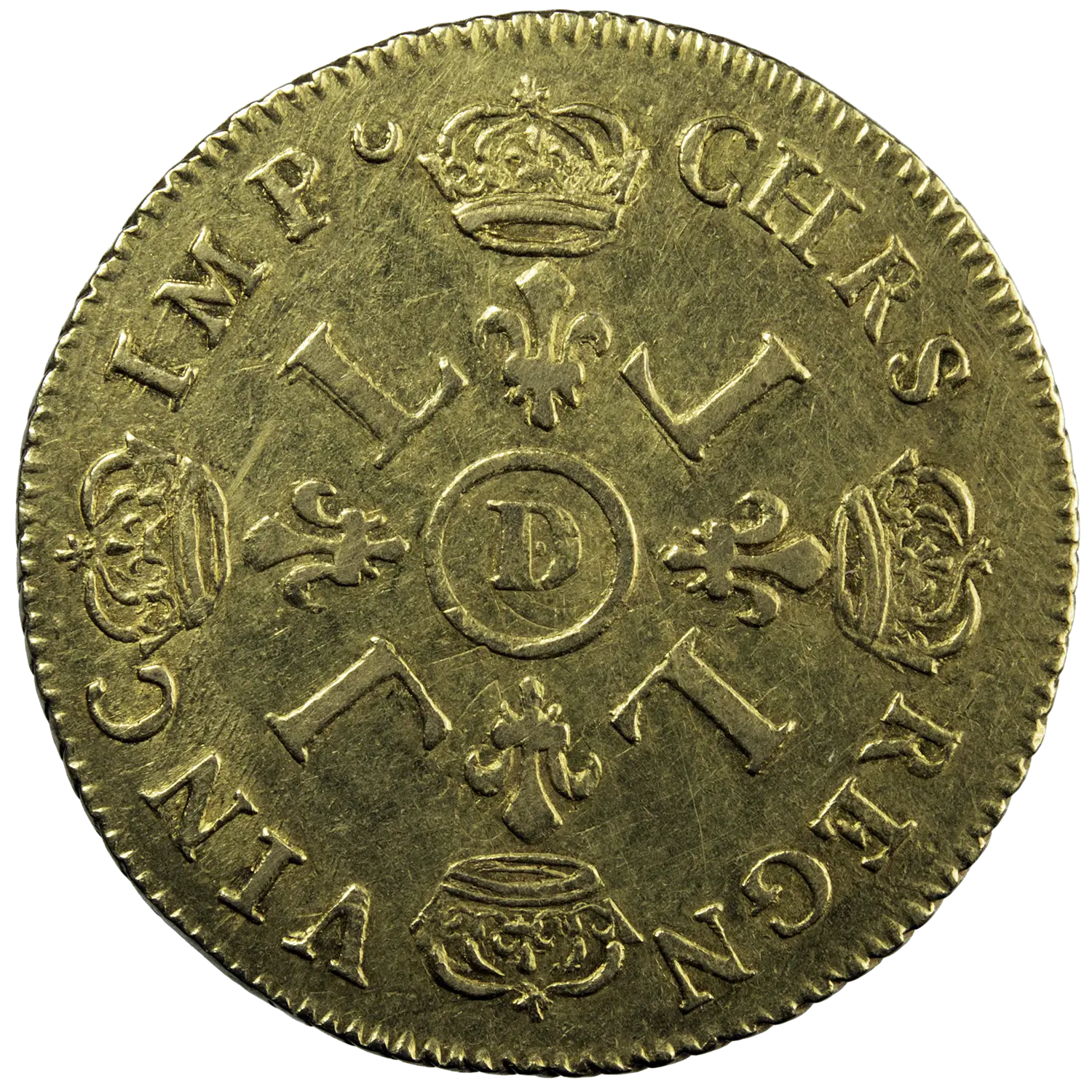 Réformation d’un double louis d’or aux 4L de Louis XIV roi de France, monnaie frappée en 1694 à Lyon, lettre d’atelier D avec un point. Anciennement gradé chez PCGS AU55 certificat 37396933.