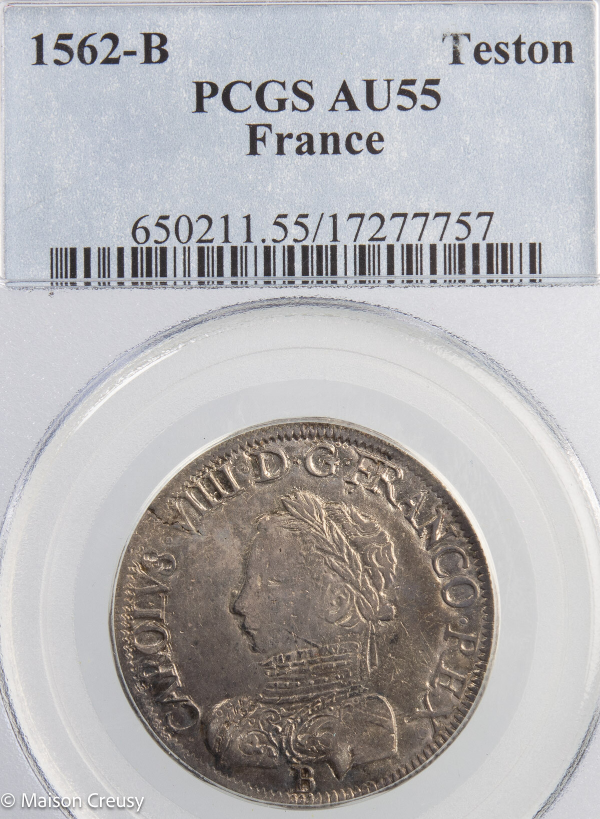 Teston en argent de Charles IX roi de France, monnaie frappée en 1562 à Rouen lettre d’atelier B. Variété de légende CAROLVS VIIII  D G FRANCO REX
