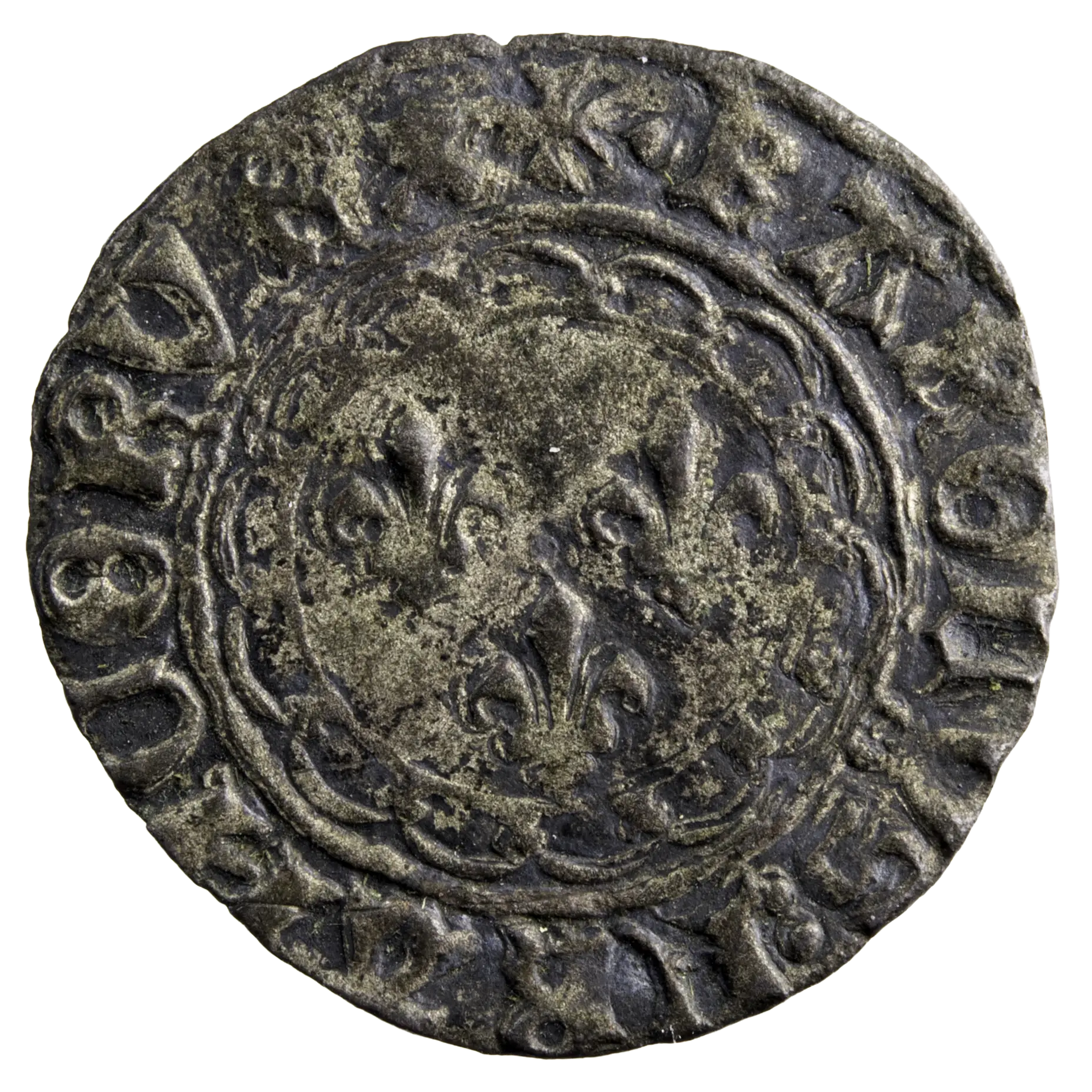 Charles VII double tournois dentillé Tours, annelet 6ème. Trois lis dans un polylobe bouleté, point après la croisette à l’avers. Le X de DVPLEX est fermé en haut. Seul exemplaire retrouvé.