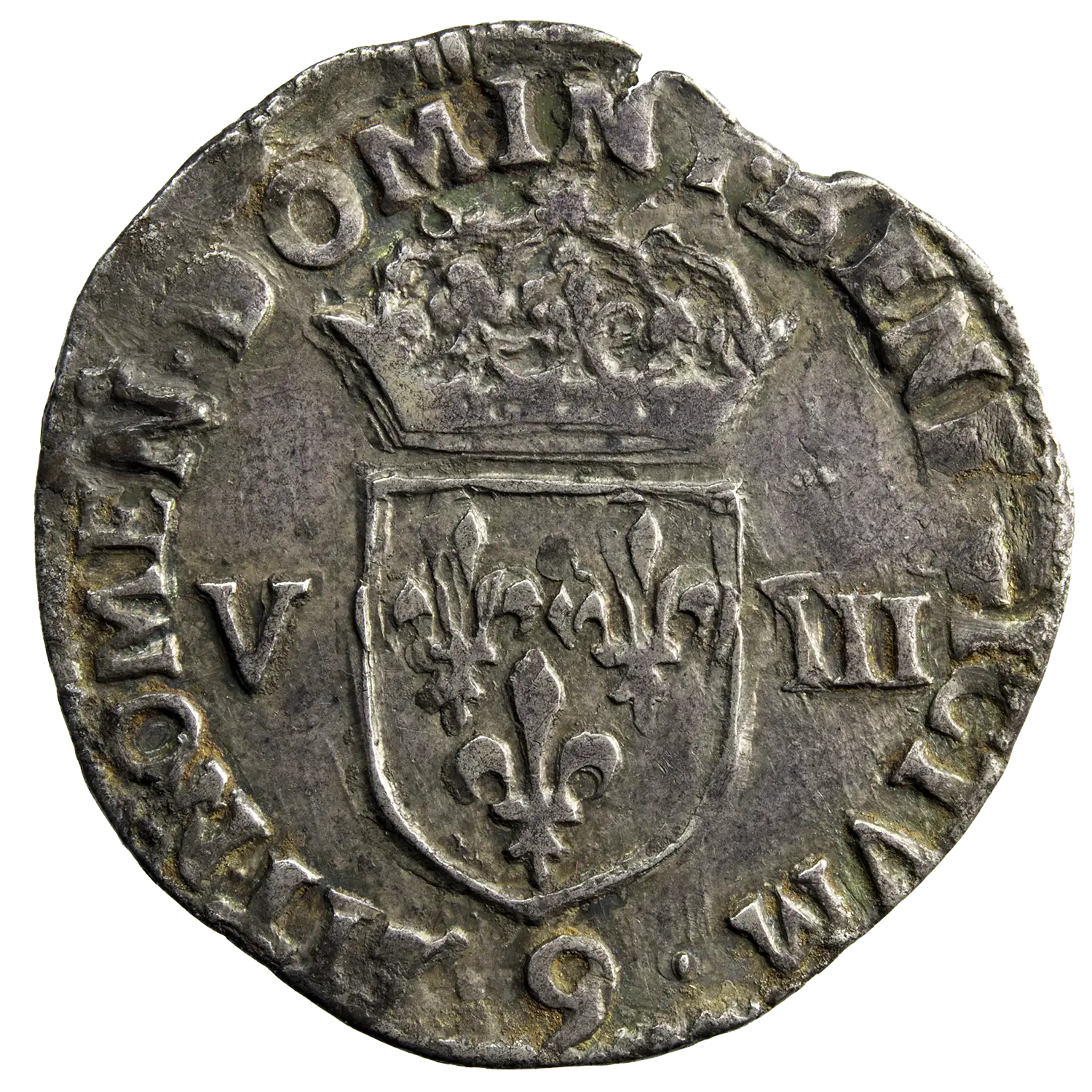 Huitième d’écu en argent d’Henri IV roi de France, monnaie frappée en 1603 à Rennes lettre d’atelier 9 sous l’écu. R3 dans le Gadoury