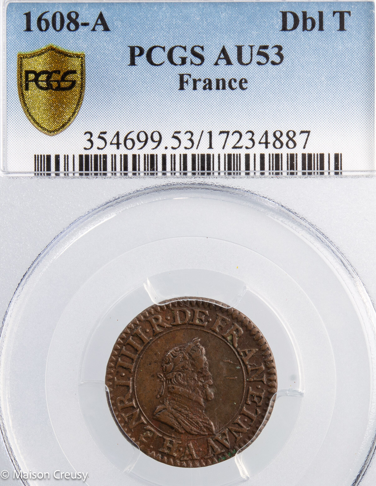 Double tournois de cuivre frappé sous Henri IV roi de France, monnaie frappée en 1608 à Paris (A). Monnaie certifié par PCGS AU53 (About Uncirculated).