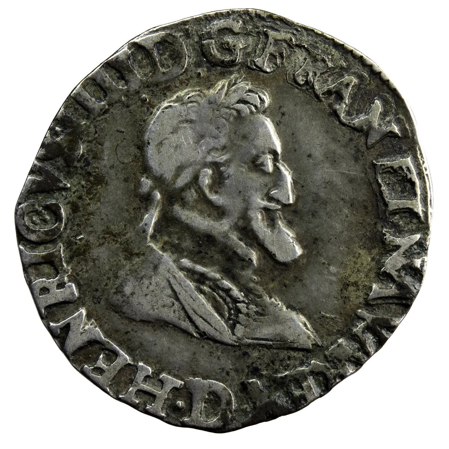 Rare quart de franc en argent d’Henri IV roi de France, monnaie frappée en 1594 dans les ateliers de Lyon sous la direction du maitre de monnaie Jean Filliard (1594-1597).