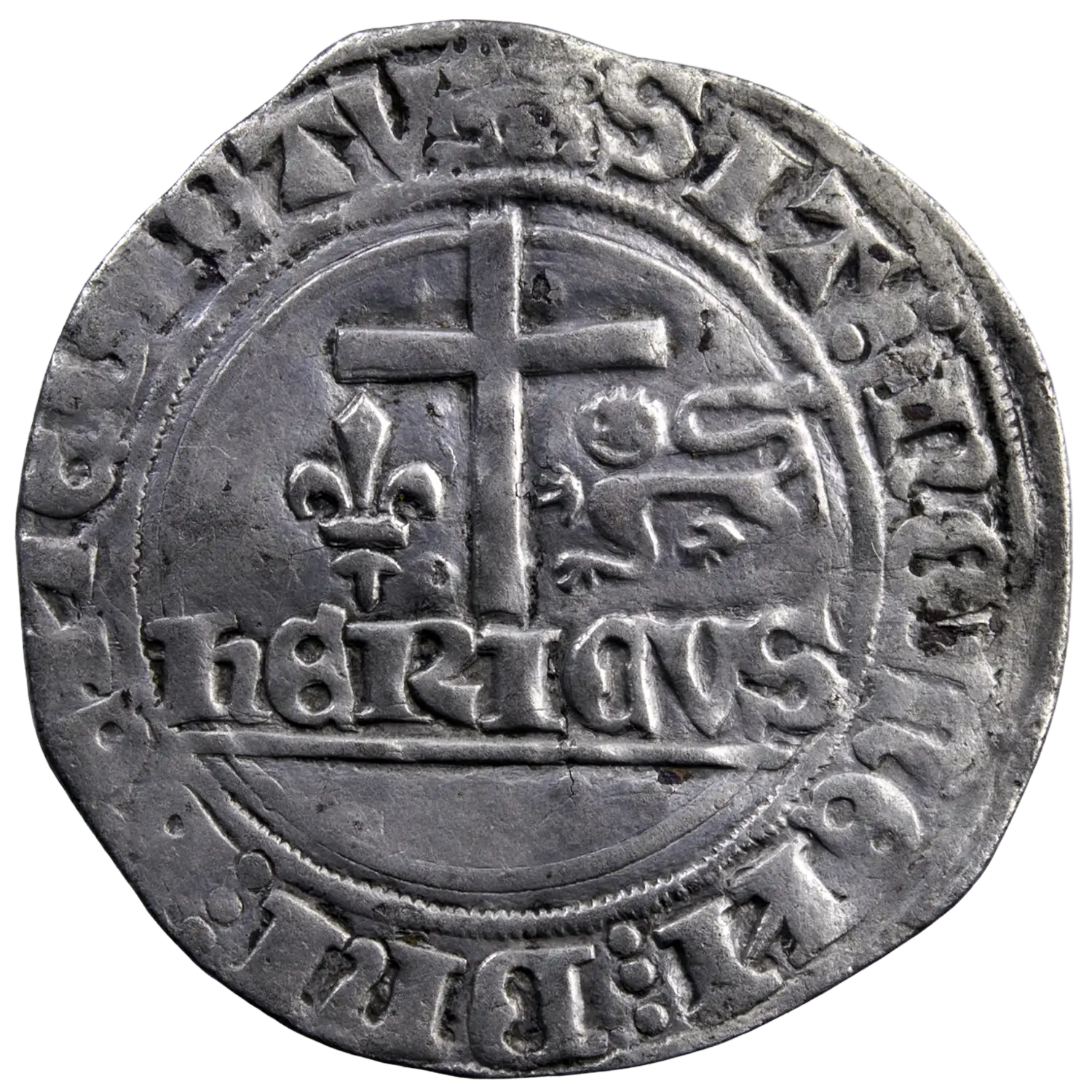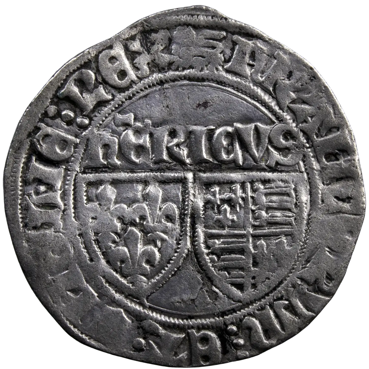Blancs aux écus frappé sous Henri VI roi de France et d’Angleterre à Rouen à partir du 23 novembre 1422. Ecu de France et d’Angleterre au dessus HERICVS.