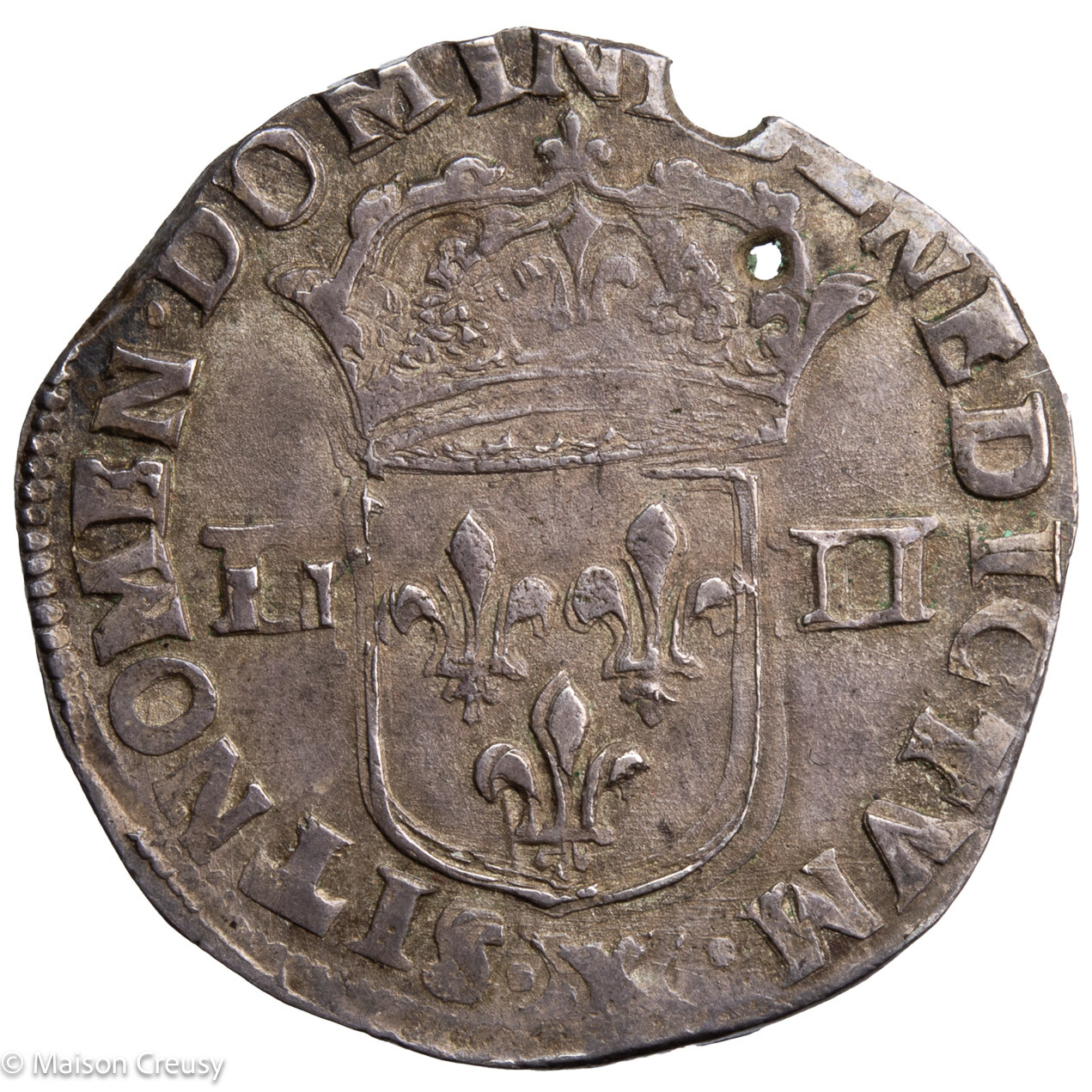 Quart d’écu de Louis XIV titulaire du coté de la croix, monnaie frappée en 1645 à Marseille. Monnaie troué et ebréché. Vendu avec sa vieille etiquette mentionnant un achat chez Rolland le 19 avril 1934