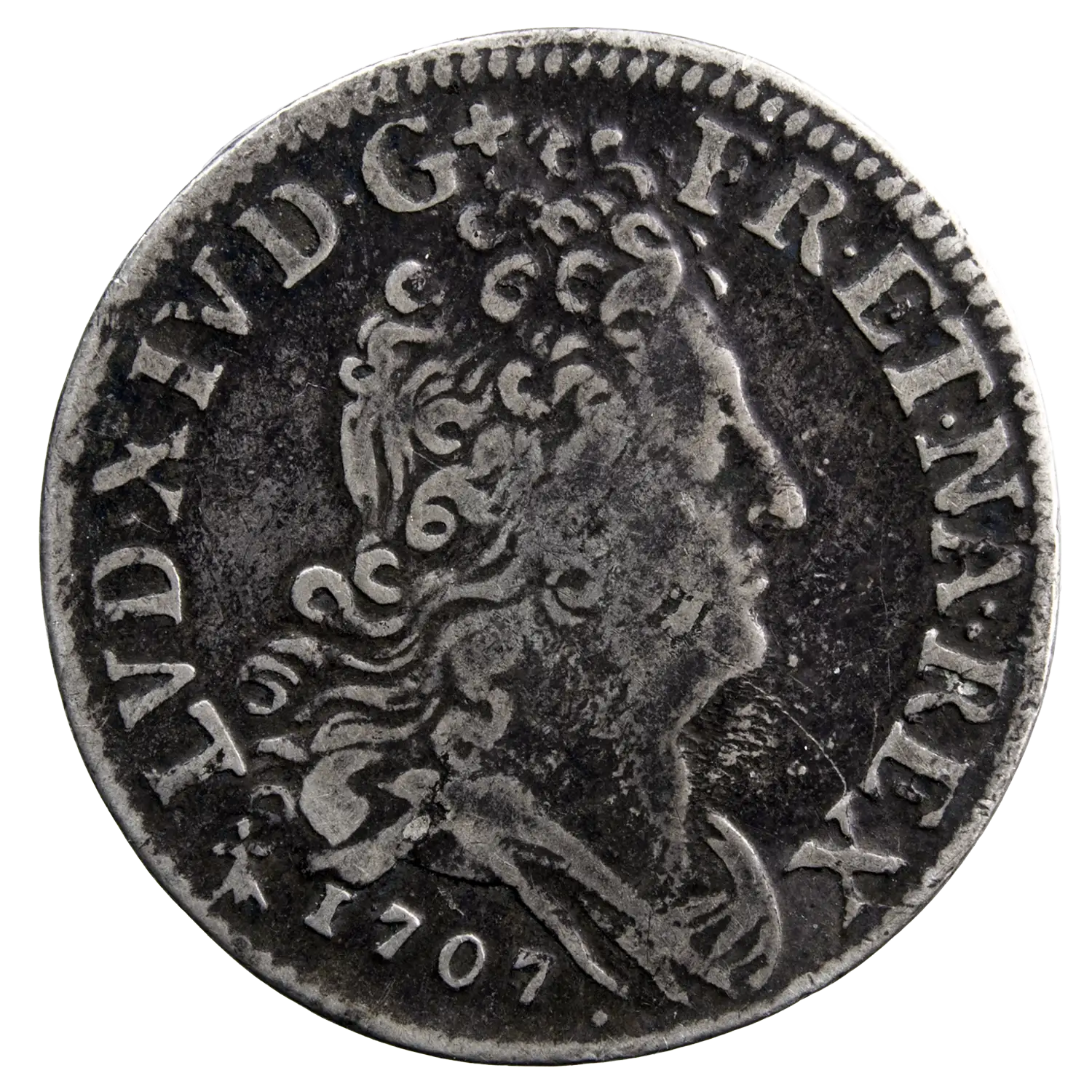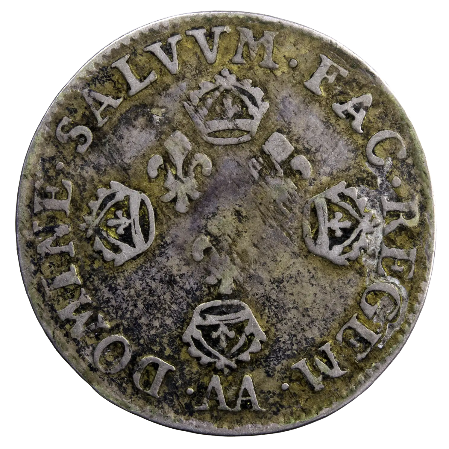 Cette petite pièce d’argent est nommé 10 sols des trois-évêchés aux quatre couronnes dans le Clairand. Buste de Louis XIV à droite à l’avers et 3 lis entourés de 4 couronnes au revers